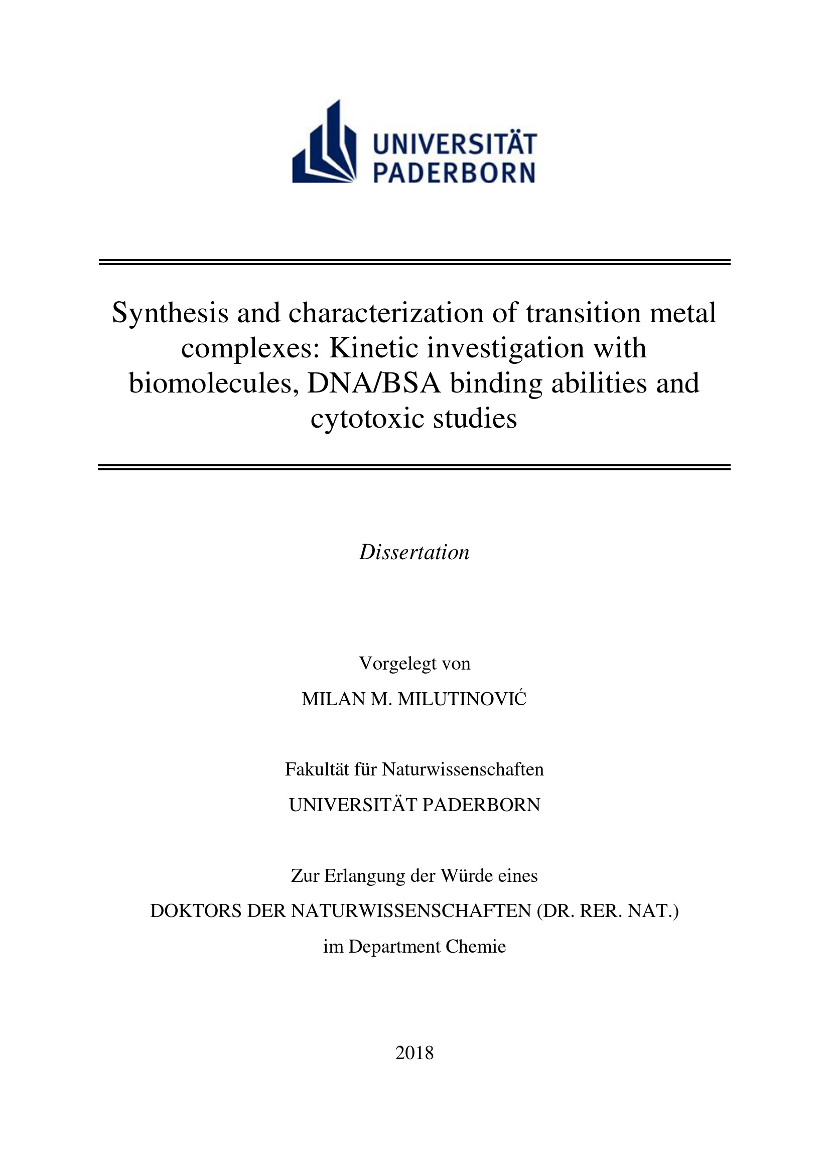 Synthesis and characterization of transition metal complexes : kinetic investigation with biomolecules, DNA/BSA binding abilities and cytotoxic studies / vorgelegt von Milan M. Milutinović ; [Prof. Dr. René Wilhelm, Erstgutachter, Prof. Dr. Jovana Bogojeski, Zweitgutachter]