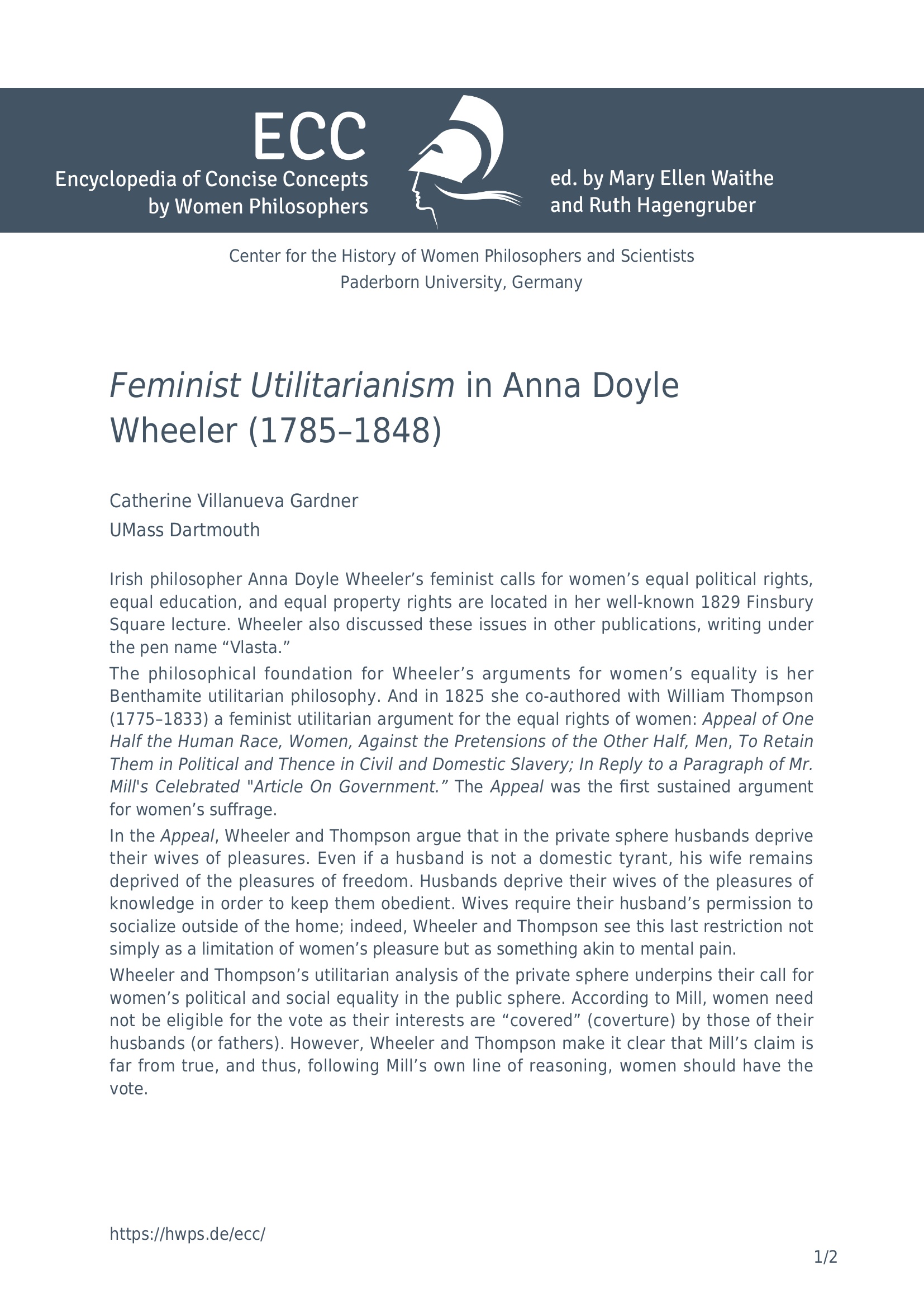 Feminist utilitarianism in Anna Doyle Wheeler (1785-1848) / Catherine Villanueva, Gardner UMass Dartmouth