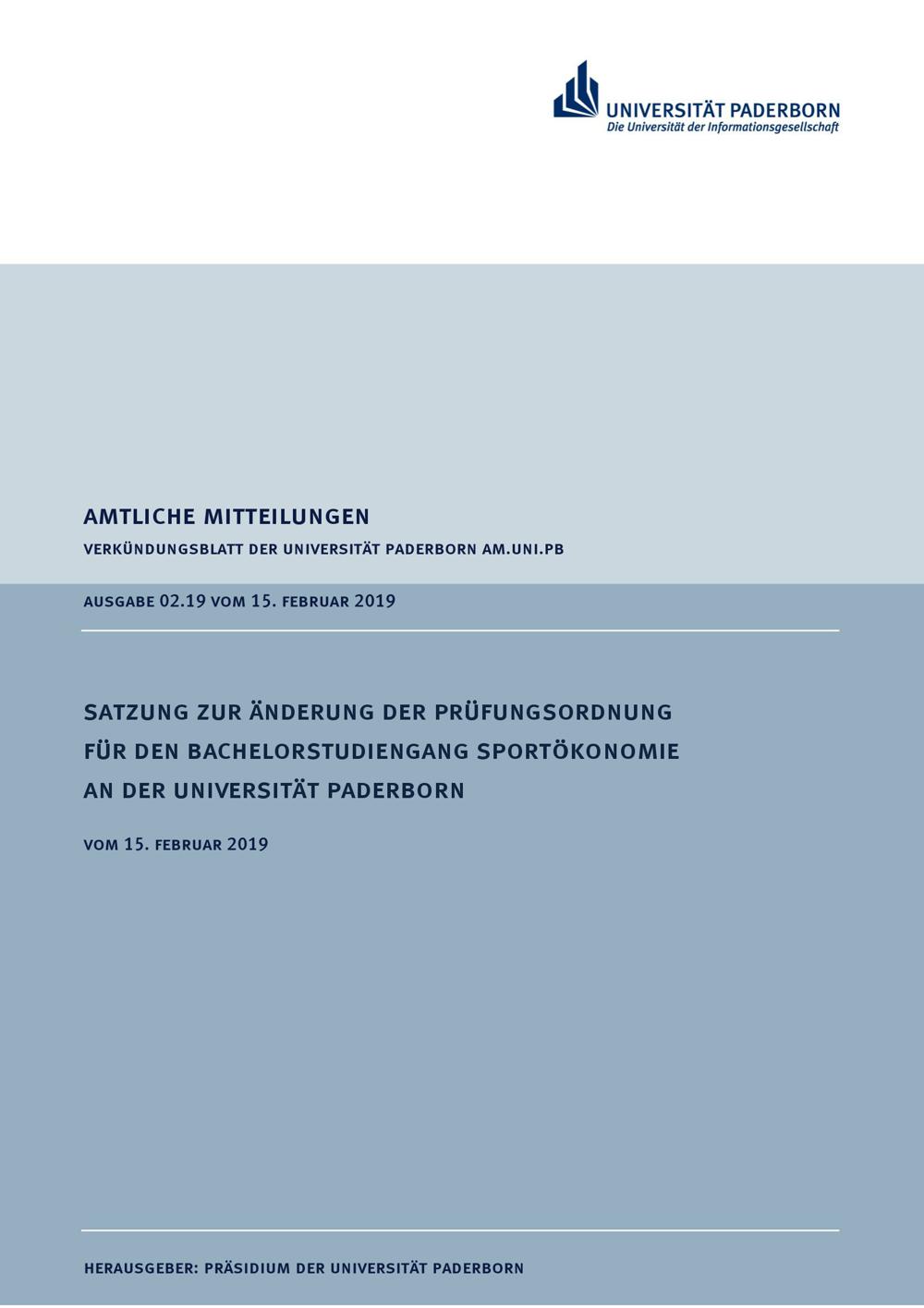 Satzung zur Änderung der Prüfungsordnung für den Bachelorstudiengang Sportökonomie an der Universität Paderborn : vom 15. Feburar 2019