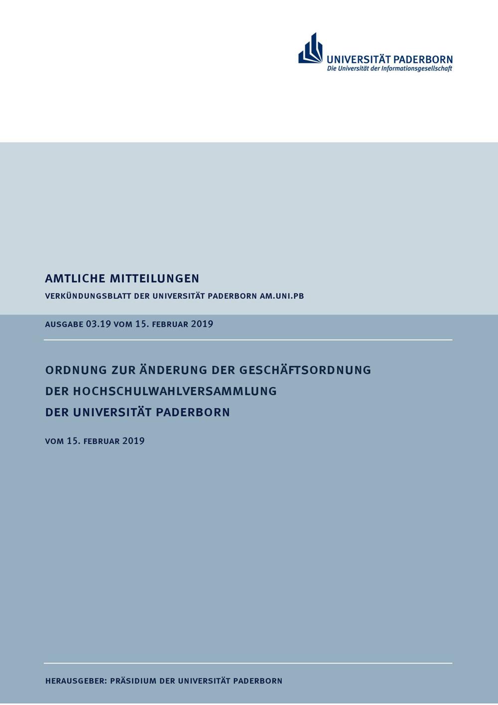 Ordnung zur Änderung der Geschäftsordnung der Hochschulwahlversammlung der Universität Paderborn : vom 15. Februar 2019