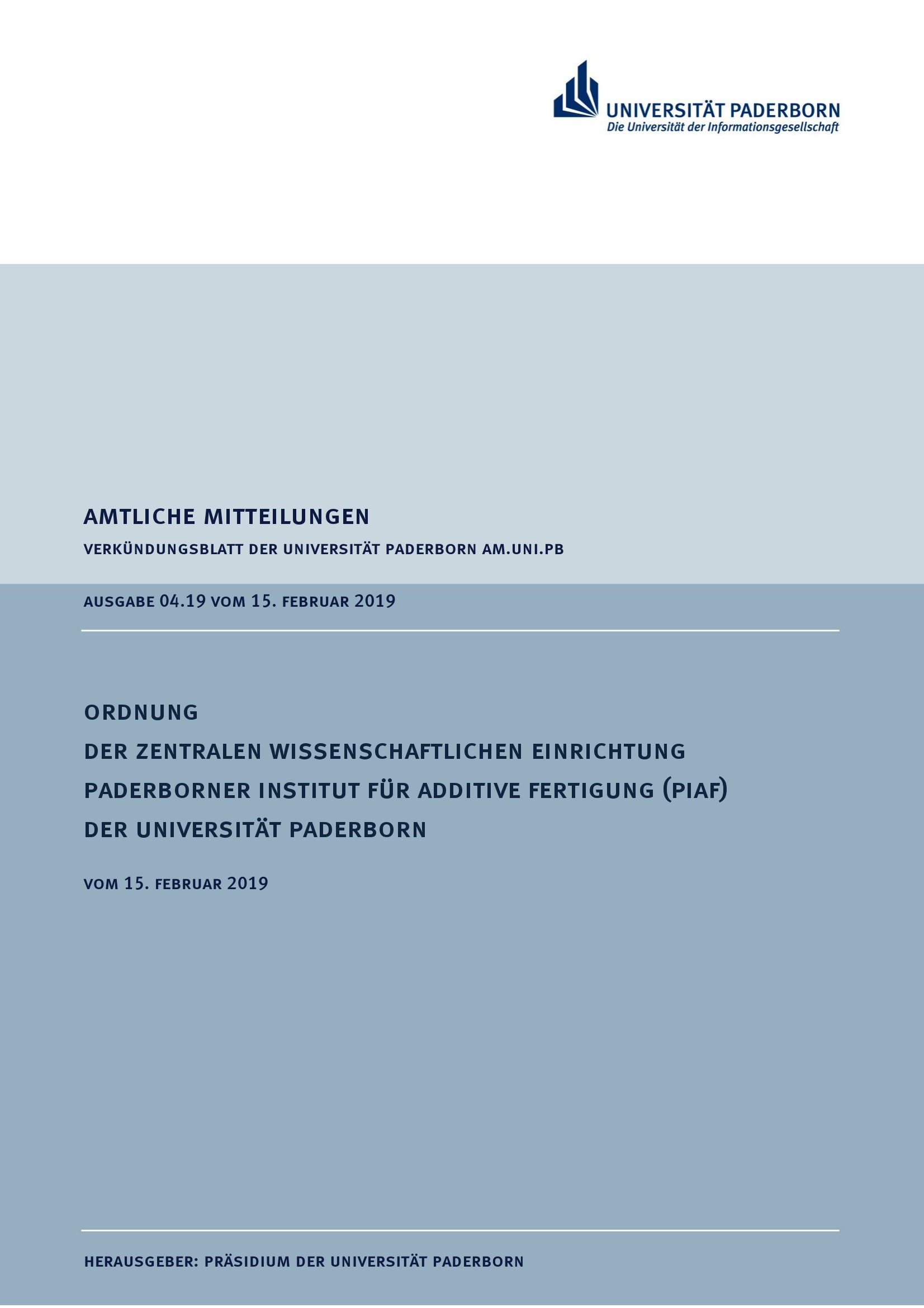 Ordnung der zentralen wissenschaftlichen Einrichtung Paderborner Institut für Additive Fertigung (PIAF) der Universität Paderborn : vom 15. Februar 2019