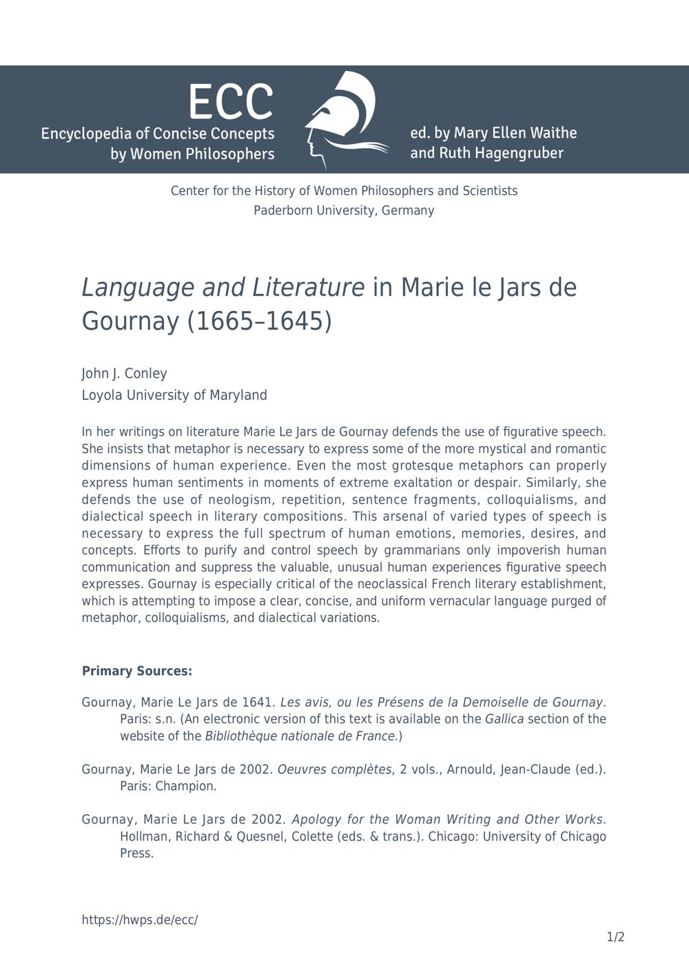 Language and literature in Marie le Jars de Gournay (1665-1645) / John J. Conley, Loyola University of Maryland