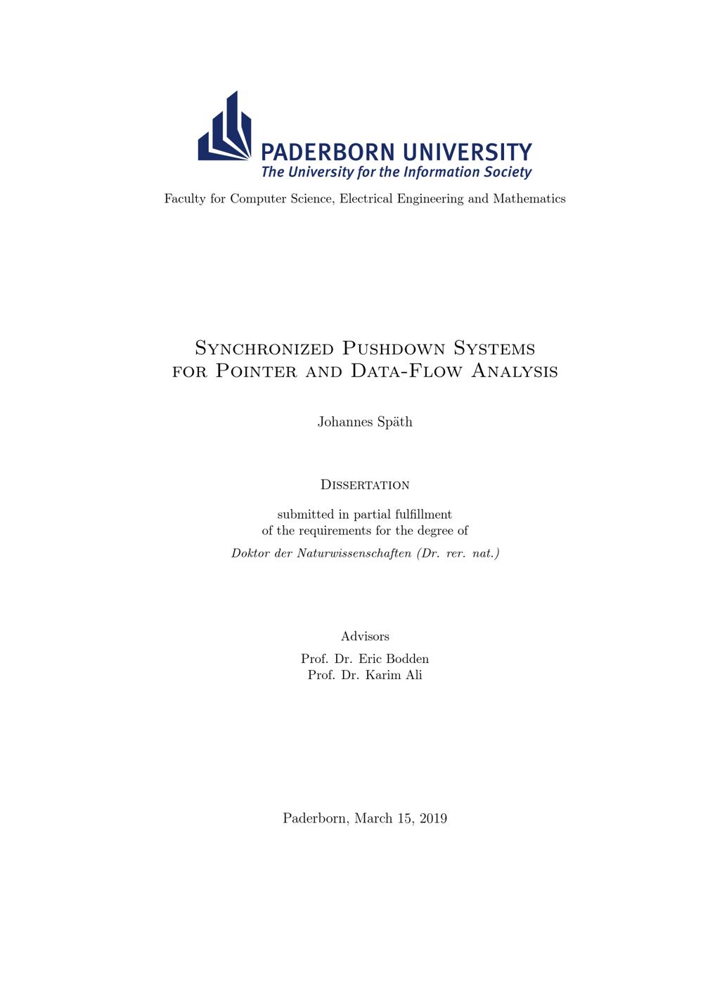 Synchronized pushdown systems for pointer and data-flow analysis / Johannes Späth ; Advisors Prof. Dr. Eric Bodden, Prof. Dr. Karim Ali