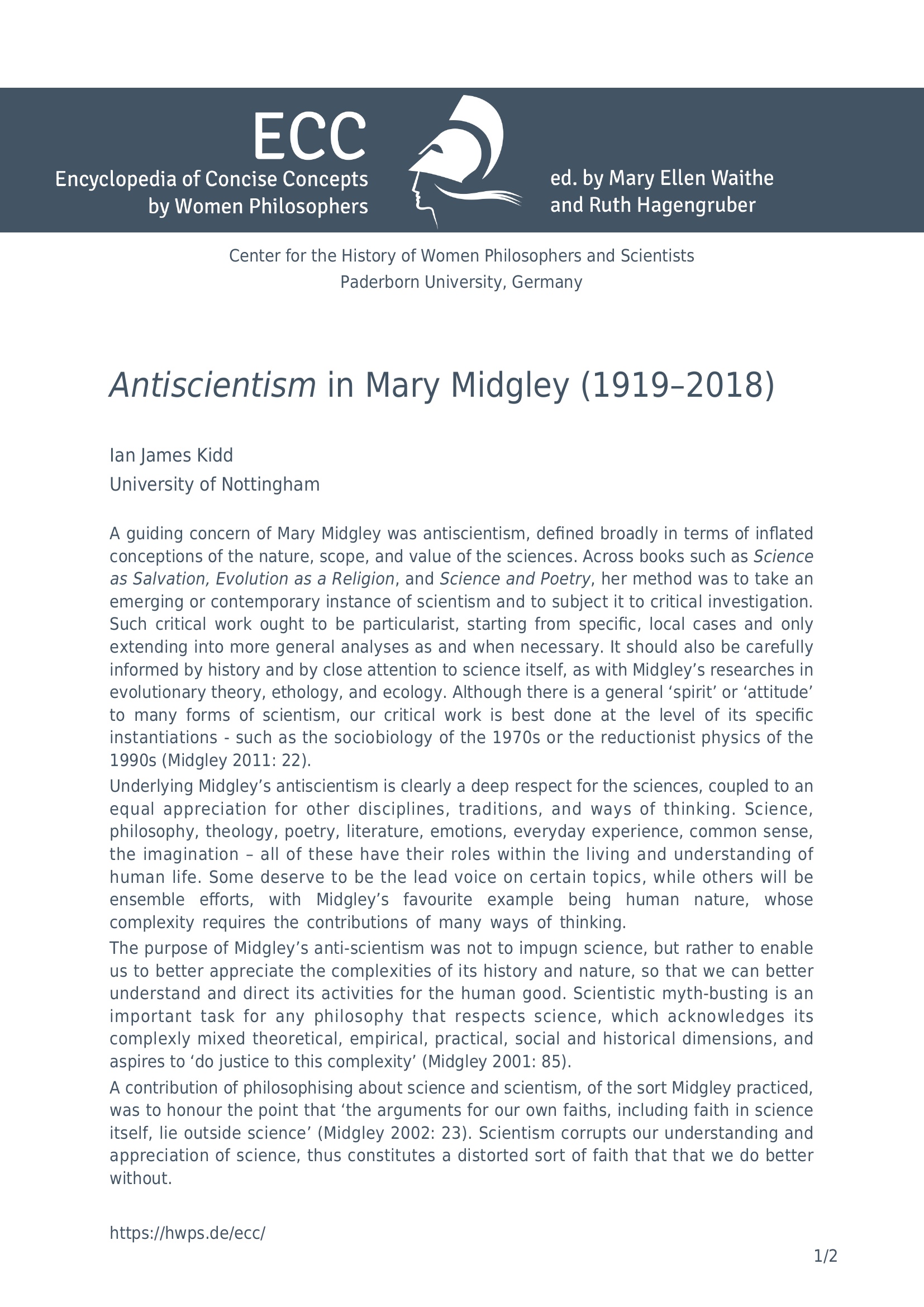 Antiscientism in Mary Midgley (1919-2018) / Ian James Kidd (University of Nottingham)