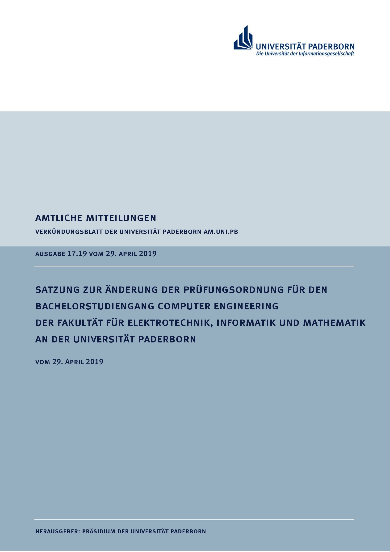 Satzung zur Änderung der Prüfungsordnung für den Bachelorstudiengang Computer Engineering der Fakultät für Elektrotechnik, Informatik und Mathematik an der Universität Paderborn : vom 29. April 2019