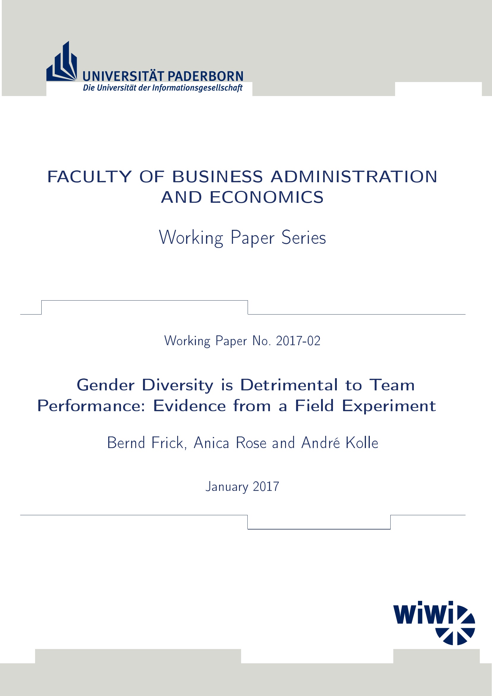 Gender diversity is detrimental to team performance: evidence from a field experiment / Bernd Frick, Anica Rose and André Kolle