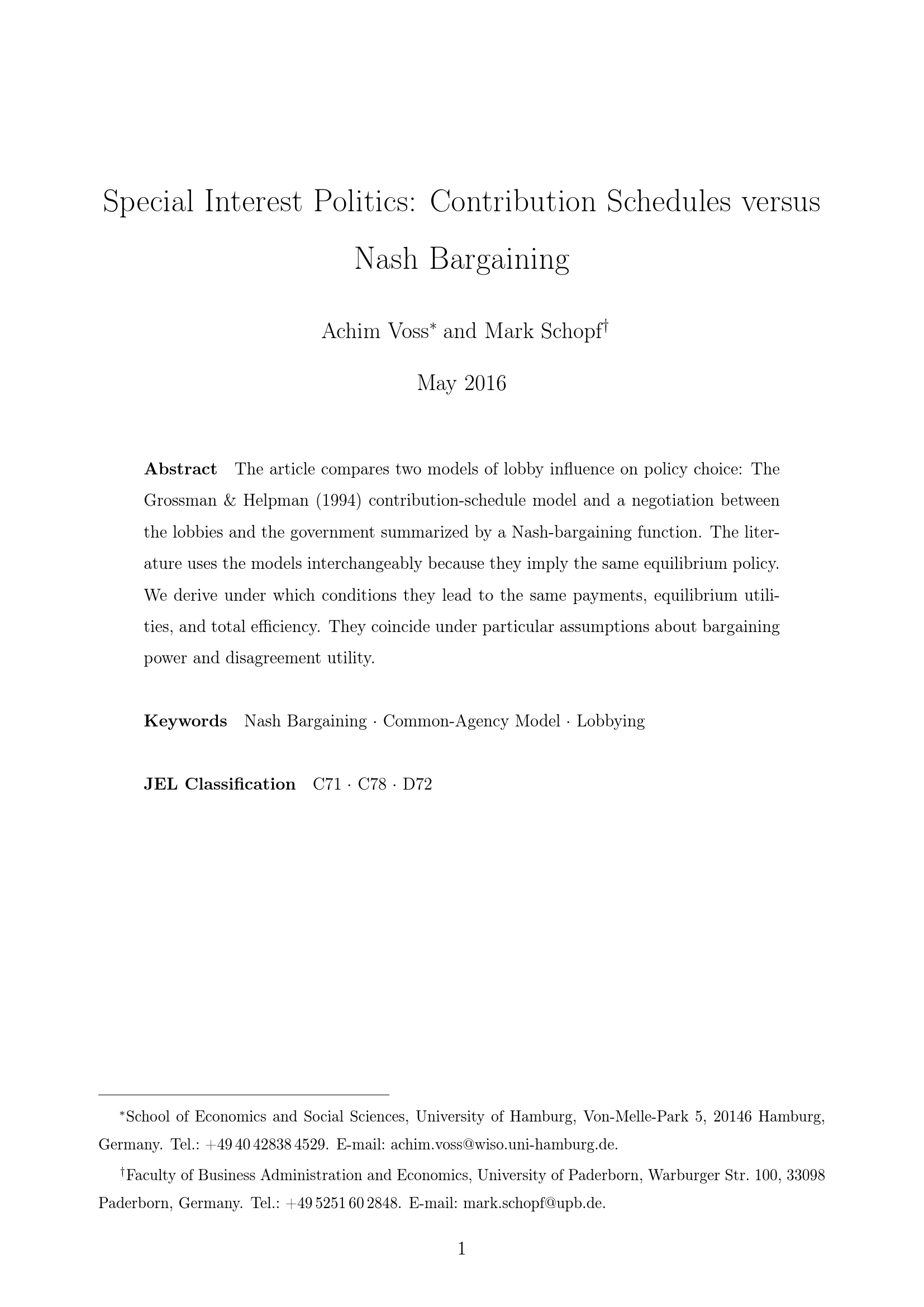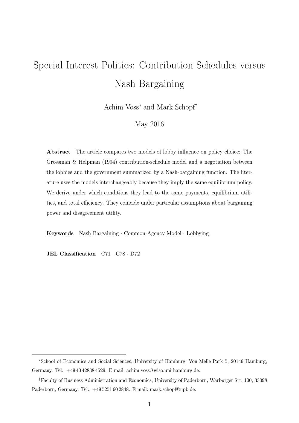 Special interest politics: Contribution schedules versus Nash bargaining / Achim Voss and Mark Schopf
