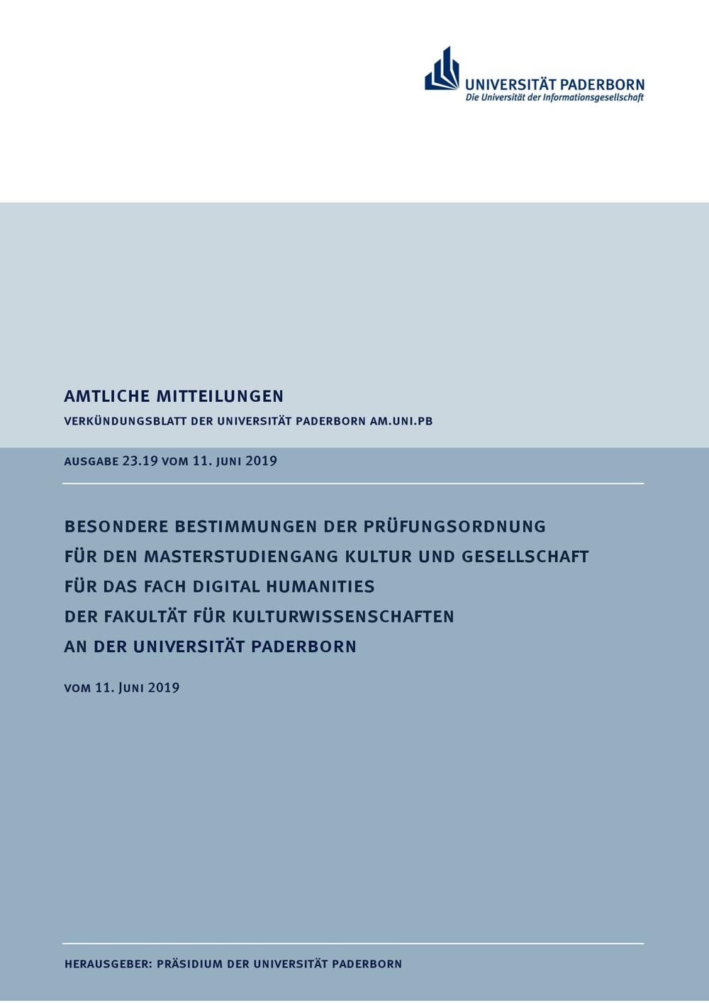 Besondere Bestimmungen der Prüfungsordnung für den Masterstudiengang "Kultur und Gesellschaft" für das Fach Digital Humanities der Fakultät für Kulturwissenschaften an der Universität Paderborn : vom 11. Juni 2019
