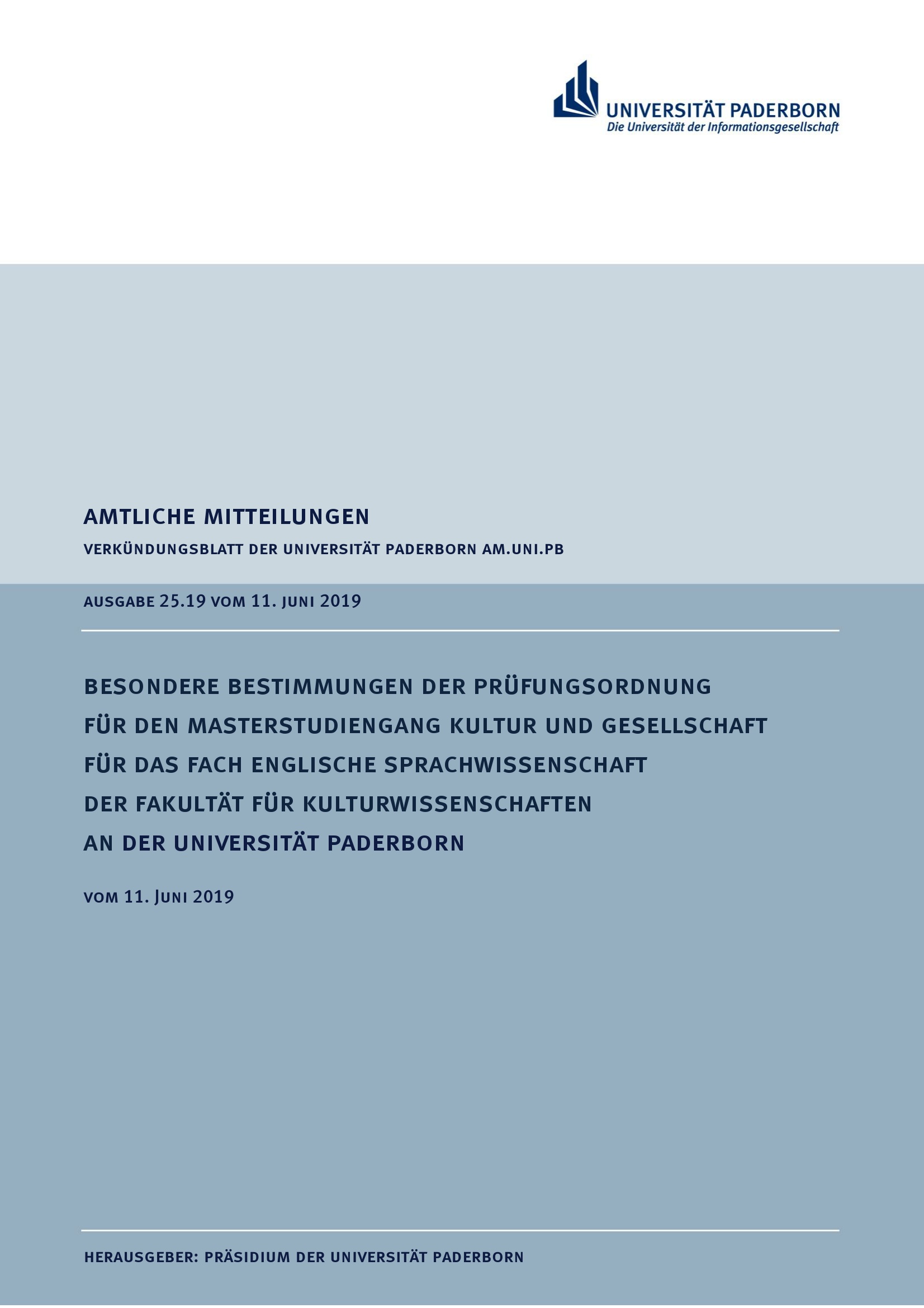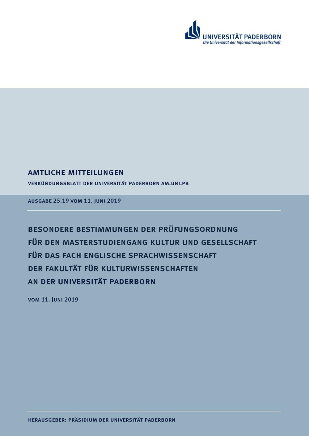 Besondere Bestimmungen der Prüfungsordnung für den Masterstudiengang Kultur und Gesellschaft für das Fach Englische Sprachwissenschaft der Fakultät für Kulturwissenschaften an der Universität Paderborn : vom 11. Juni 2019
