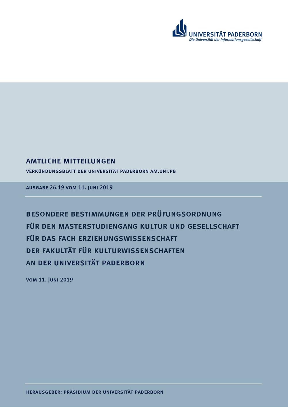 Besondere Bestimmungen der Prüfungsordnung für den Masterstudiengang Kultur und Gesellschaft für das Fach Erziehungswissenschaft der Fakultät für Kulturwissenschaften an der Universität Paderborn : vom 11. Juni 2019