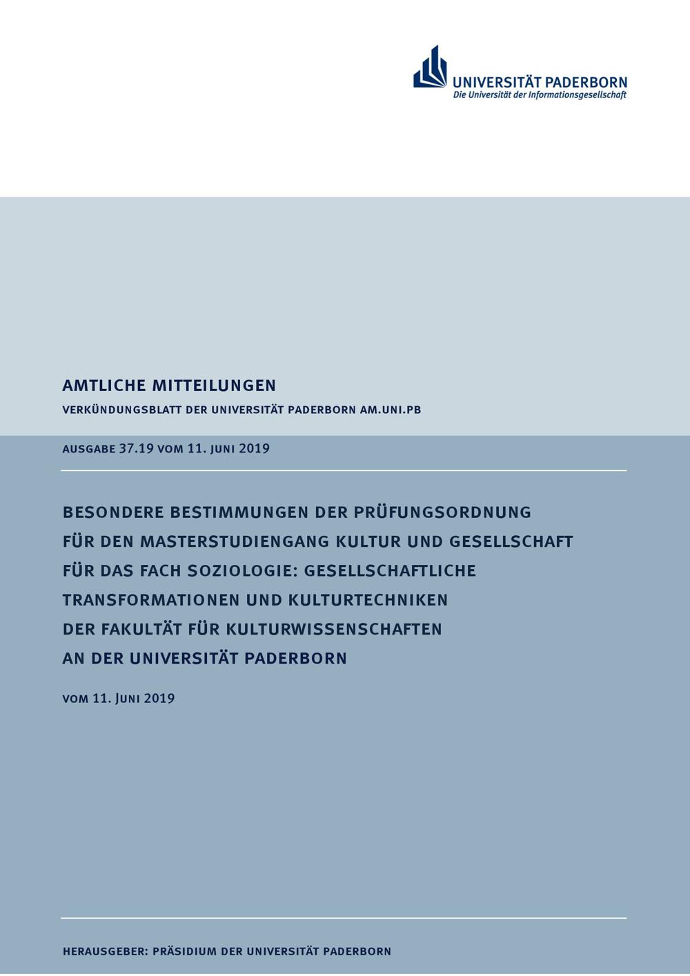 Besondere Bestimmungen der Prüfungsordnung für den Masterstudiengang Kultur und Gesellschaft für das Fach Soziologie: Gesellschaftliche Transformationen und Kulturtechniken der Fakultät für Kulturwissenschaften an der Universität Paderborn : vom 11. Juni 2019