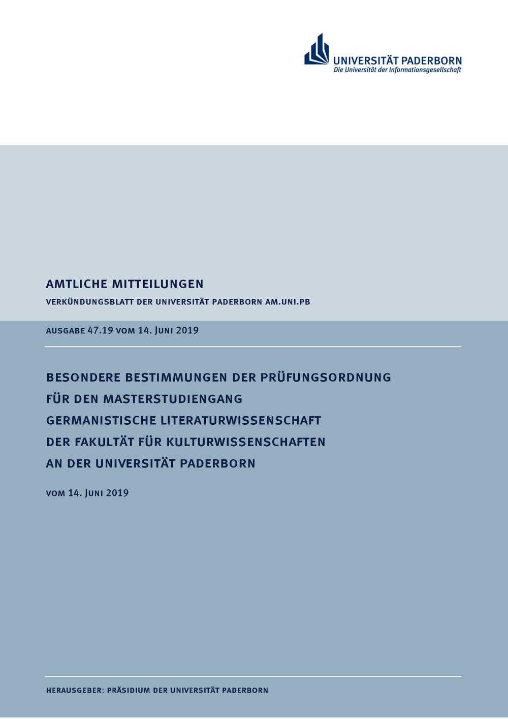 Besondere Bestimmungen der Prüfungsordnung für den Masterstudiengang Germanistische Literaturwissenschaft der Fakultät für Kulturwissenschaften an der Universität Paderborn : vom 14. Juni 2019