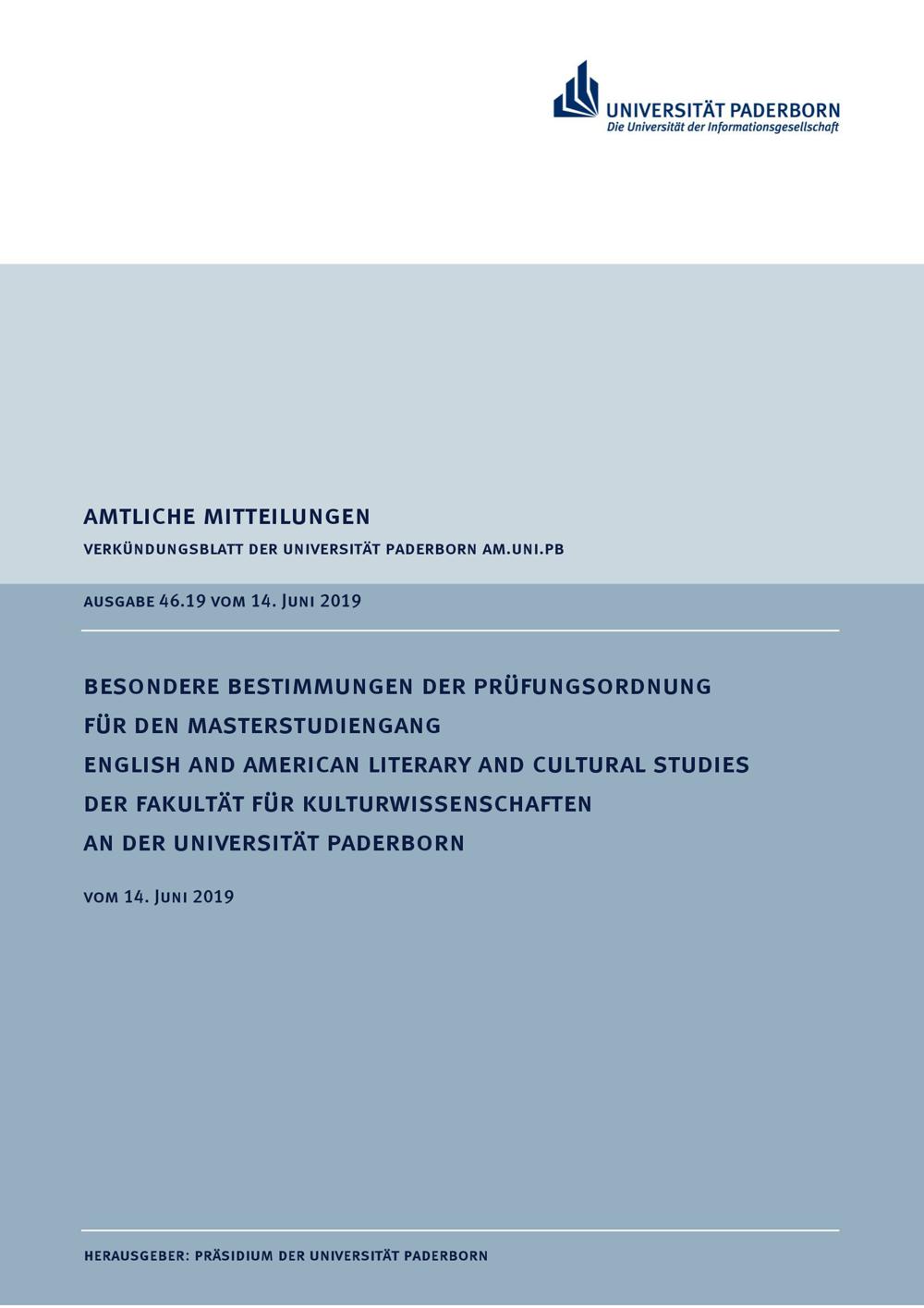 Besondere Bestimmungen der Prüfungsordnung für den Masterstudiengang English and American Literary and Cultural Studies der Fakultät für Kulturwissenschaften an der Universität Paderborn : vom 14. Juni 2019
