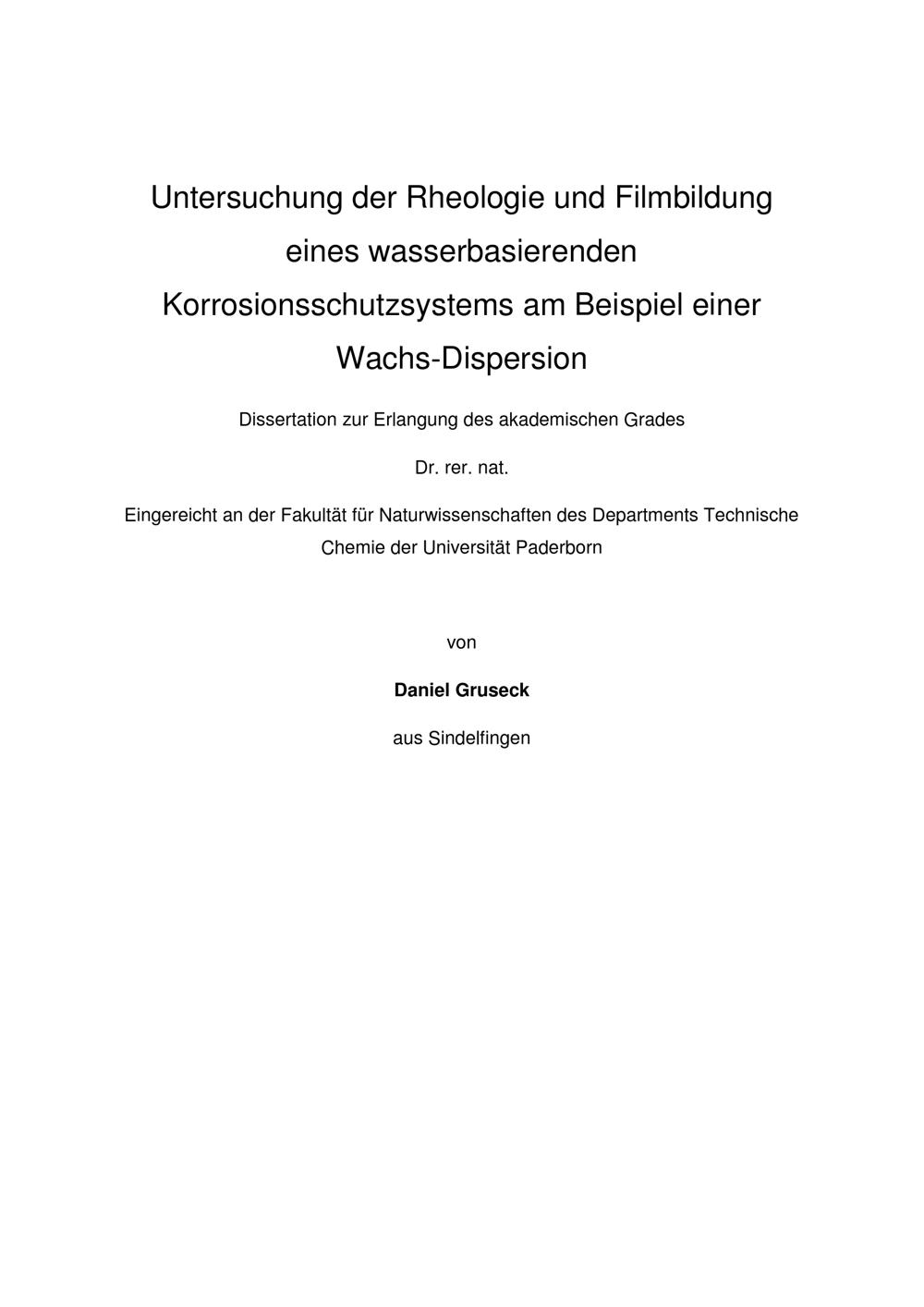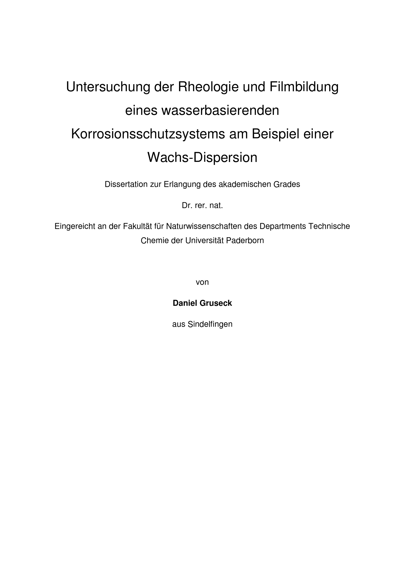 Untersuchung der Rheologie und Filmbildung eines wasserbasierenden Korrosionsschutzsystems am Beispiel einer Wachs-Dispersion / von Daniel Gruseck ; [Erster Gutachter: Prof. Dr. rer. nat. Wolfgang Bremser, Zweiter Gutachter: Prof. Dr. Ing. Jürgen Unfried]