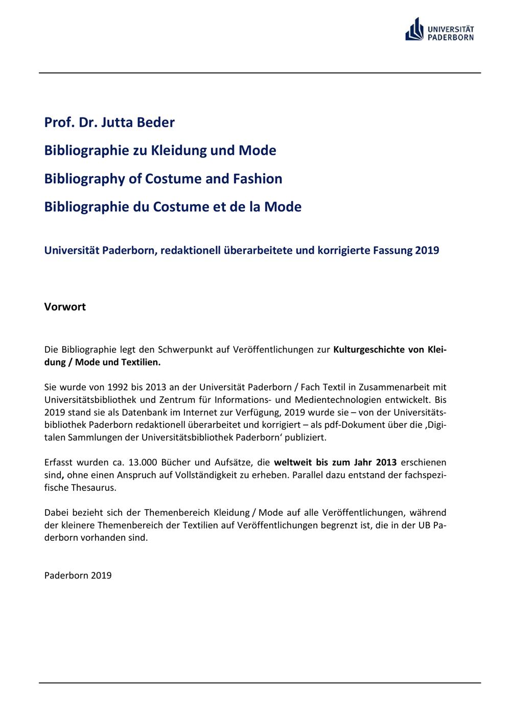 Bibliographie zu Kleidung und Mode / Prof. Dr. Jutta Beder