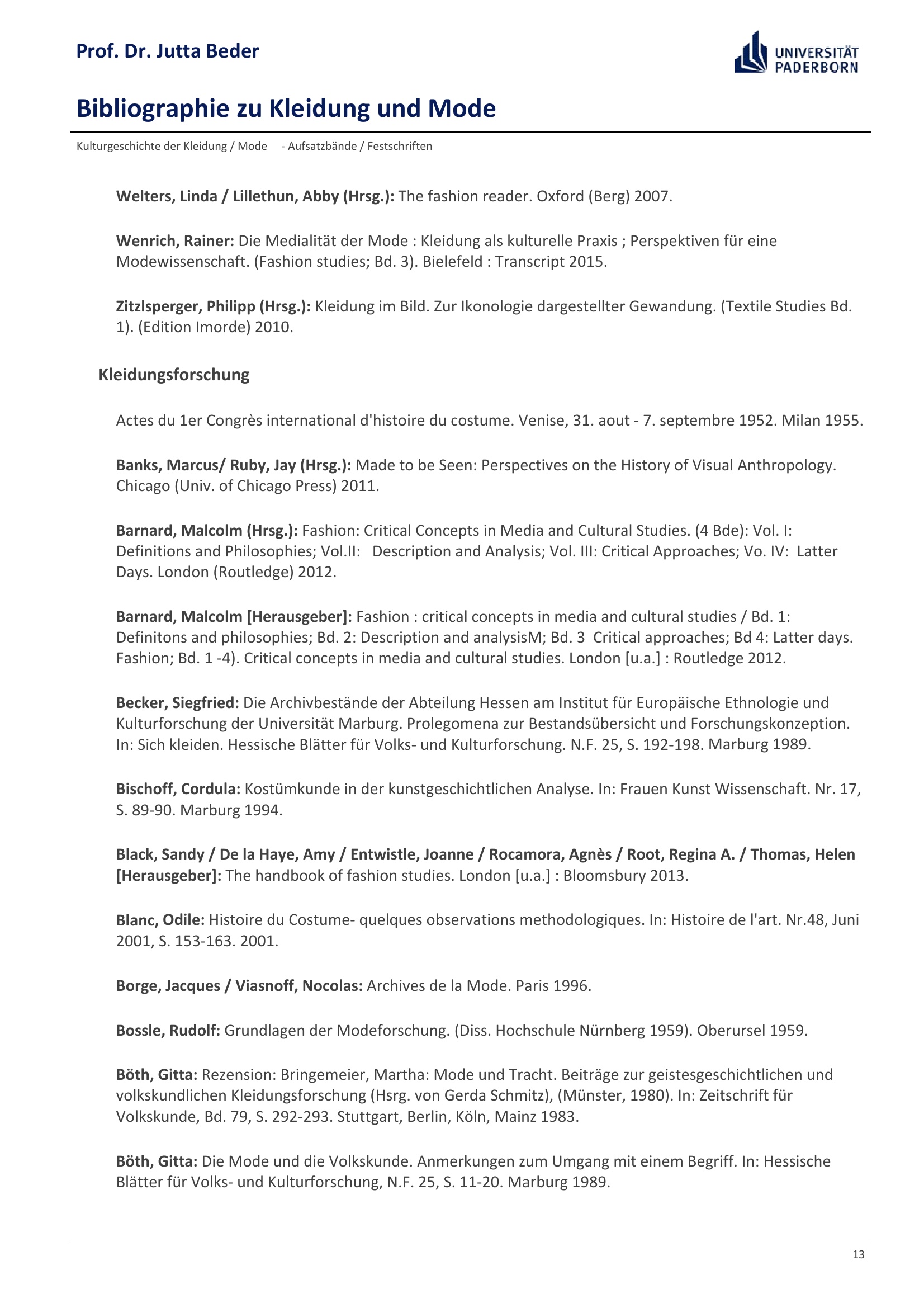 Bibliographie zu Kleidung und Mode / Prof. Dr. Jutta Beder