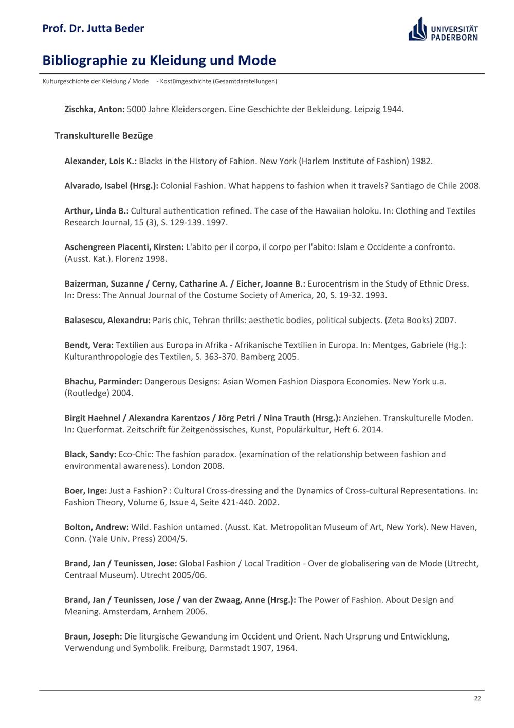 Bibliographie zu Kleidung und Mode / Prof. Dr. Jutta Beder