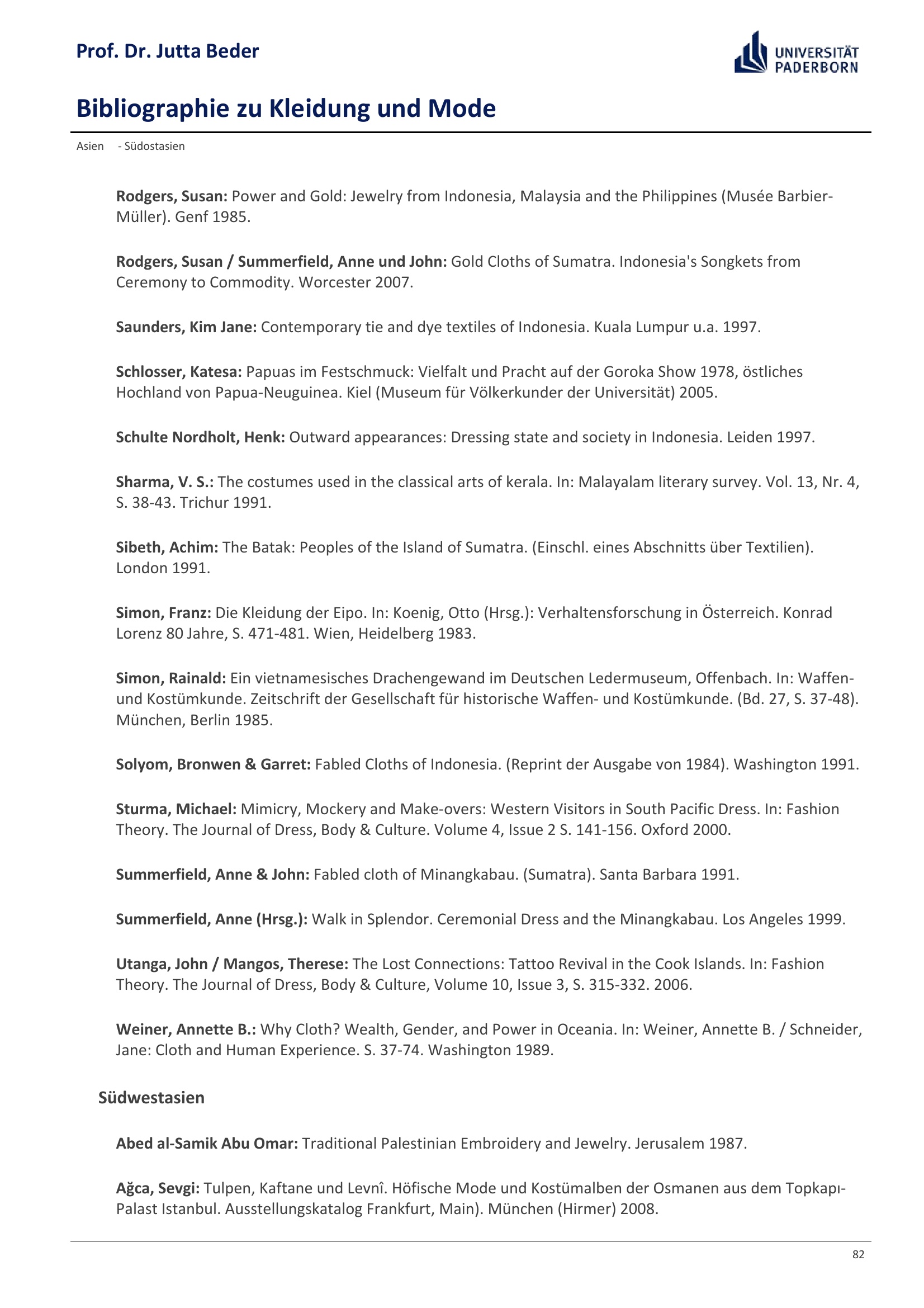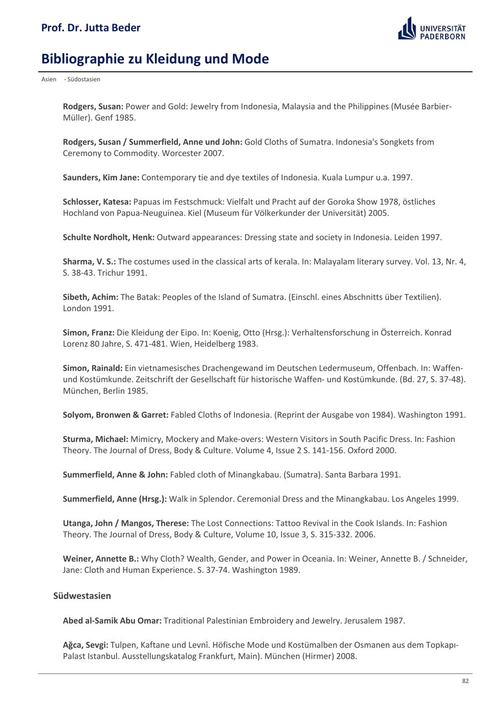 Bibliographie zu Kleidung und Mode / Prof. Dr. Jutta Beder