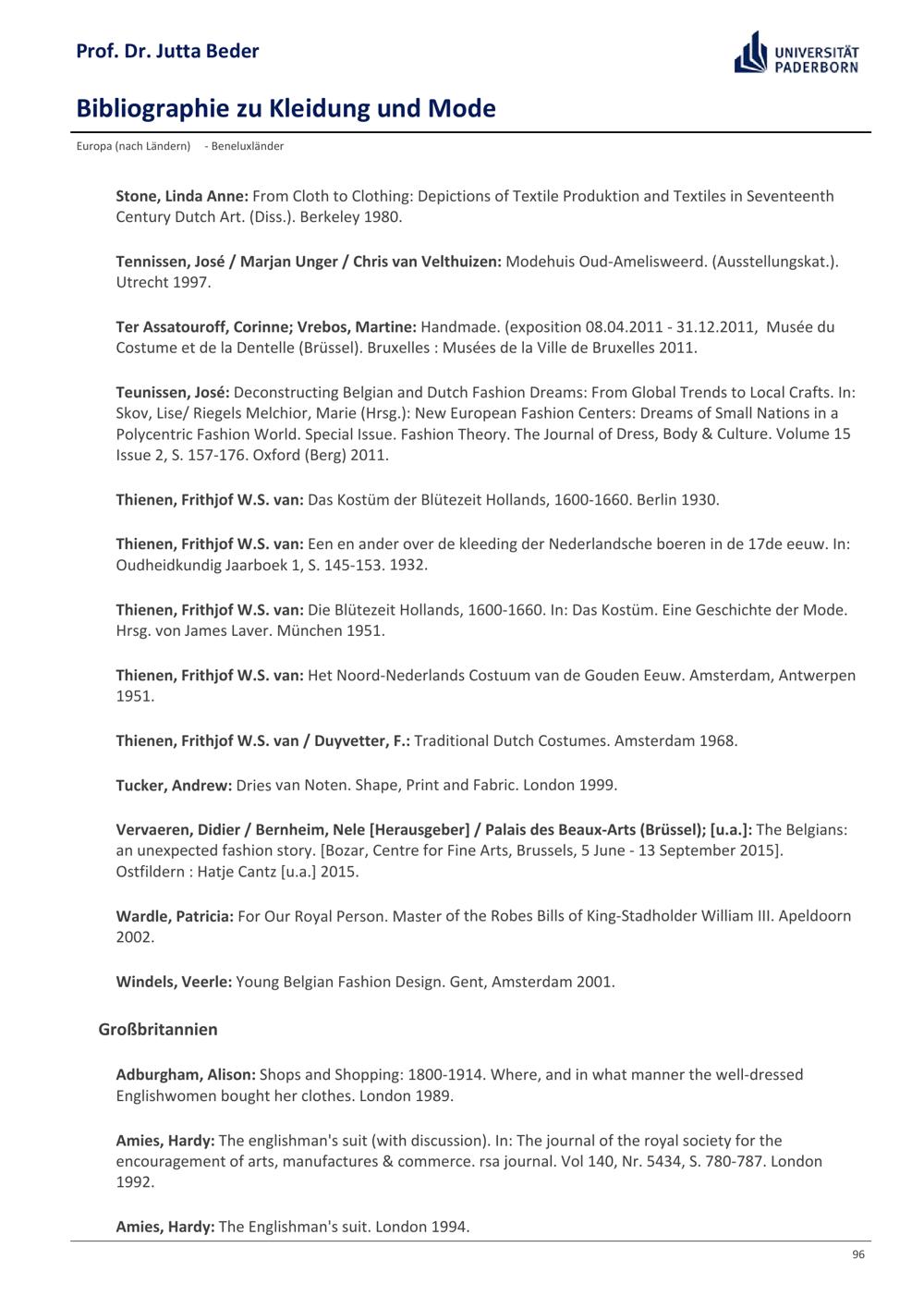 Bibliographie zu Kleidung und Mode / Prof. Dr. Jutta Beder
