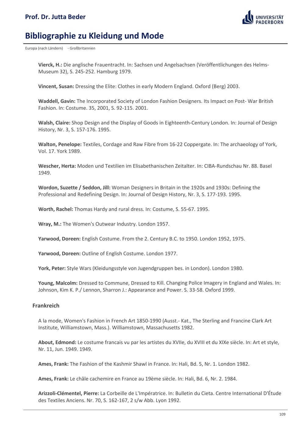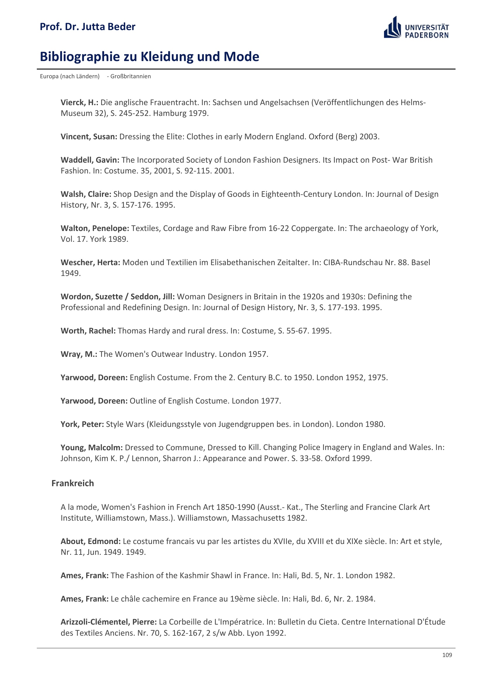 Bibliographie zu Kleidung und Mode / Prof. Dr. Jutta Beder