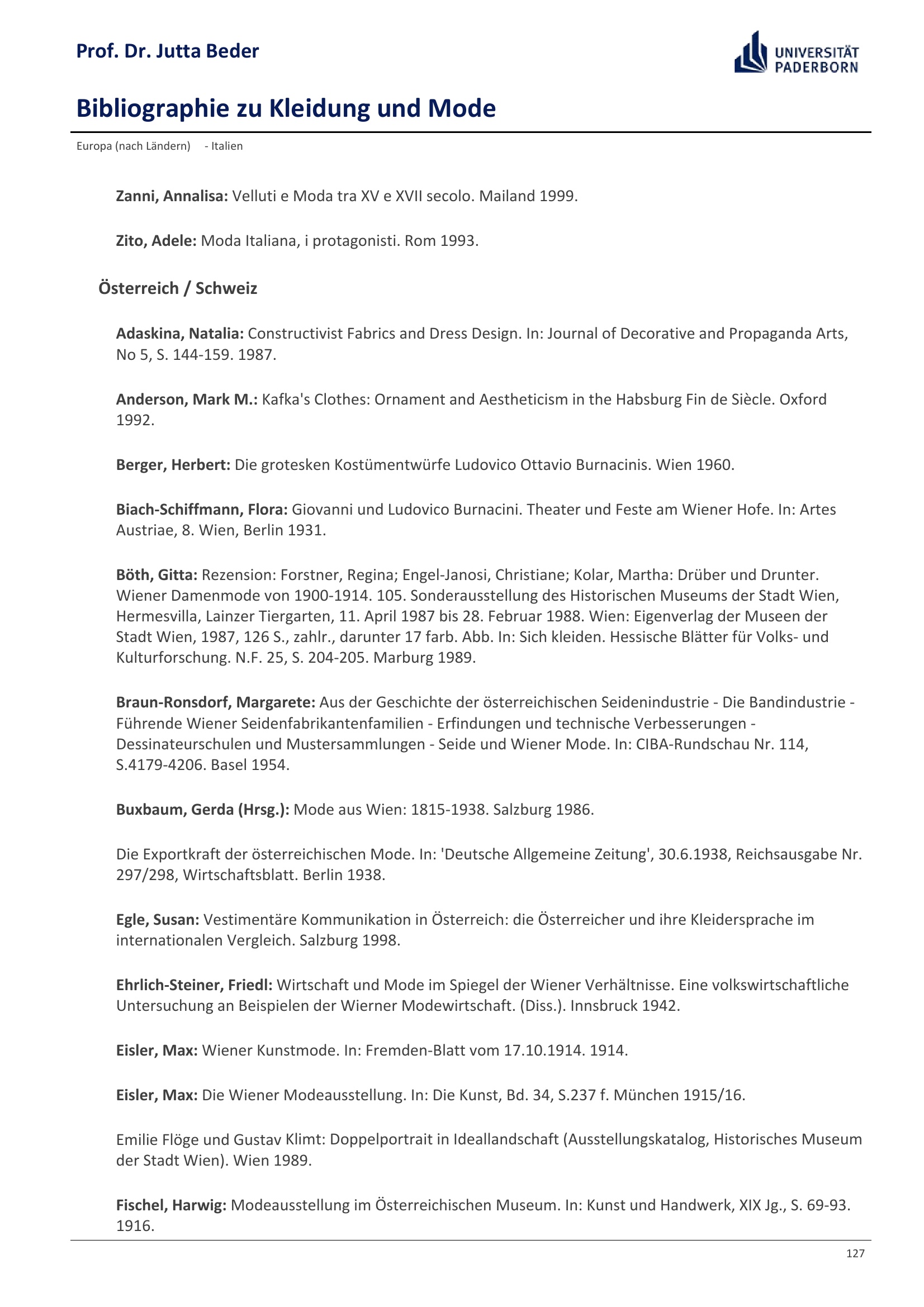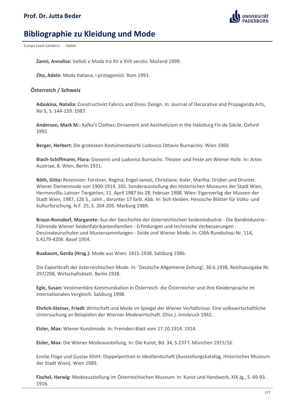 Bibliographie zu Kleidung und Mode / Prof. Dr. Jutta Beder