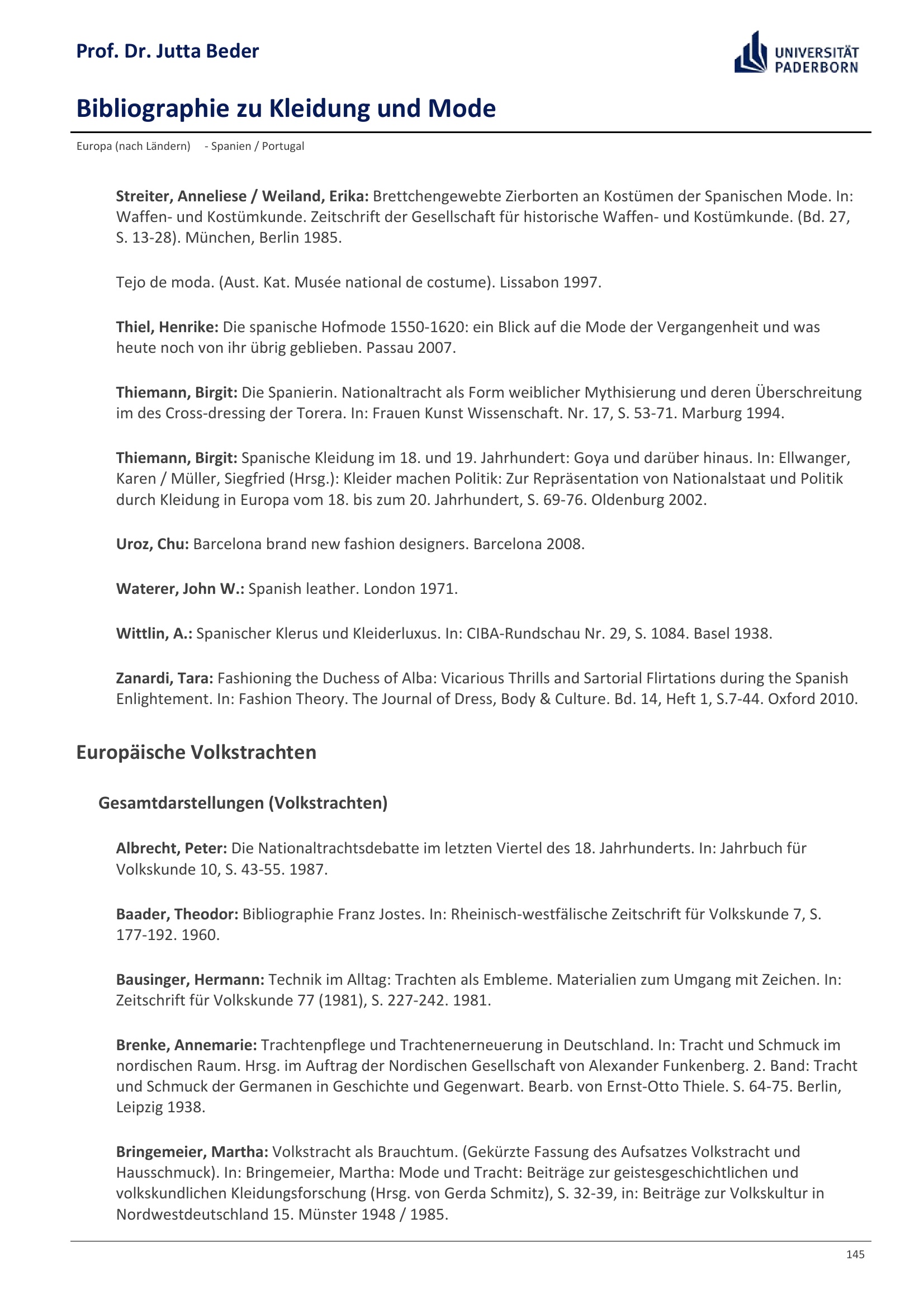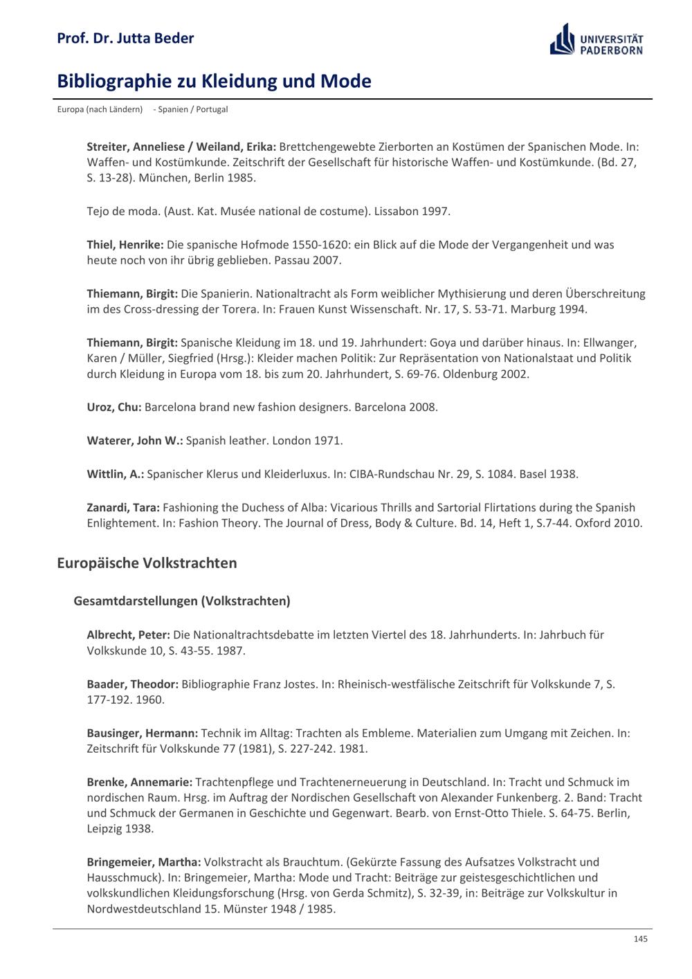 Bibliographie zu Kleidung und Mode / Prof. Dr. Jutta Beder