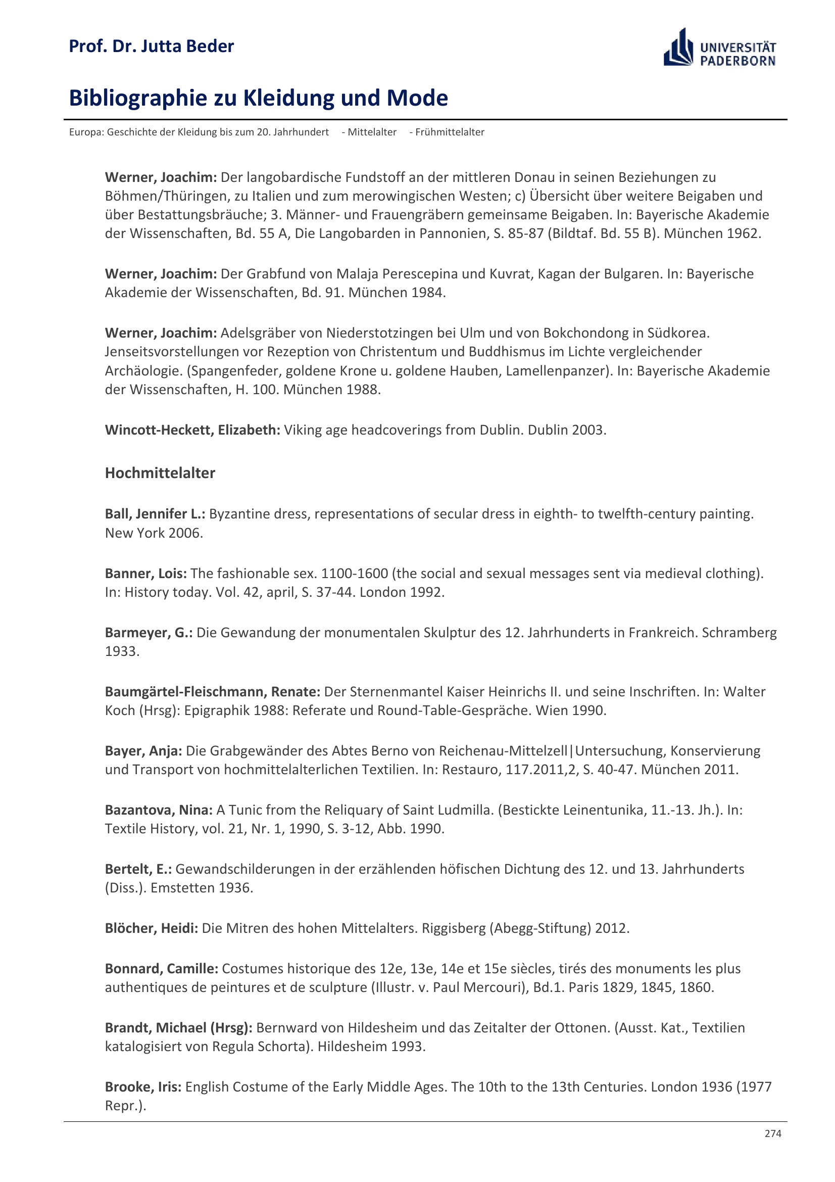 Bibliographie zu Kleidung und Mode / Prof. Dr. Jutta Beder