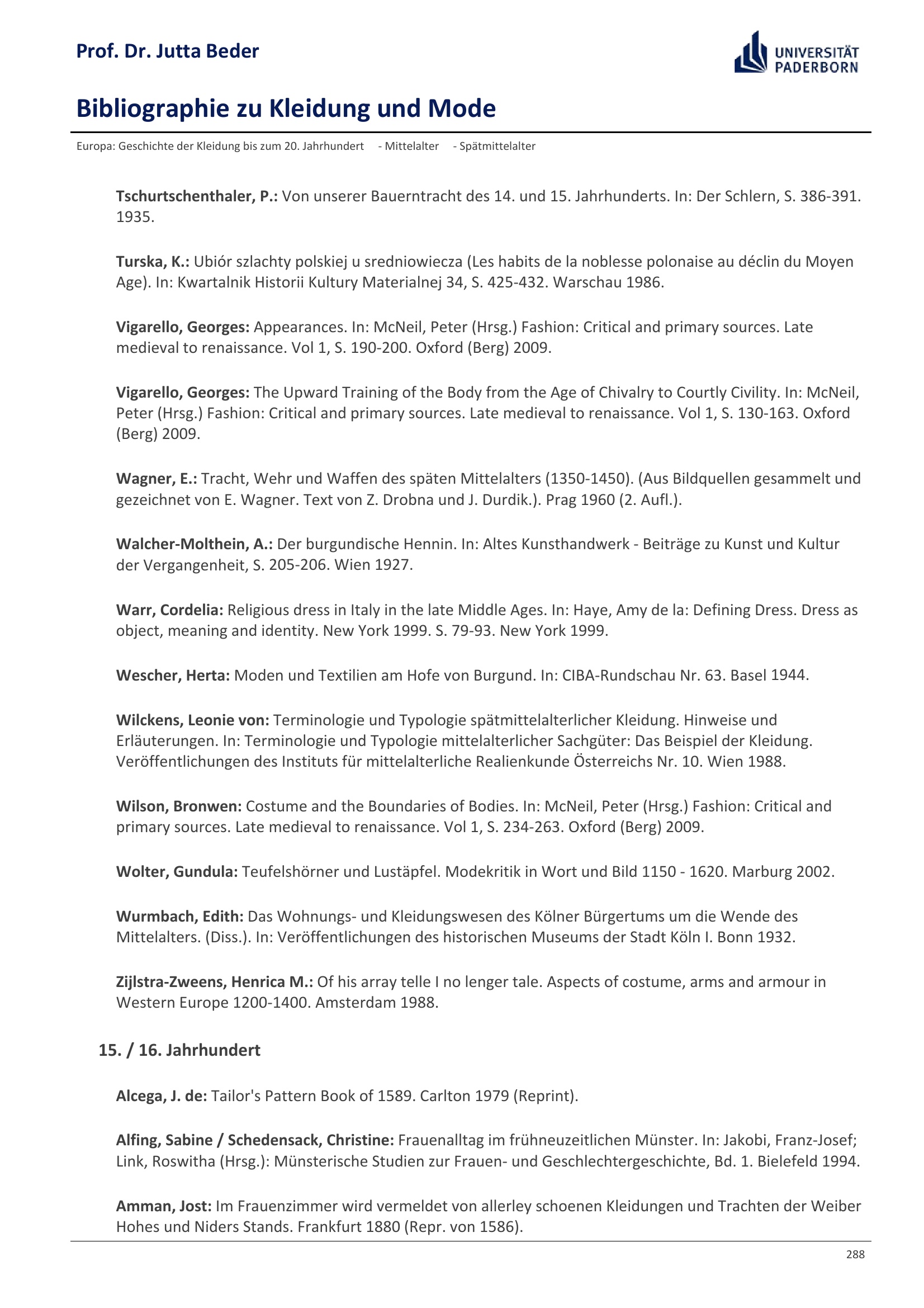 Bibliographie zu Kleidung und Mode / Prof. Dr. Jutta Beder