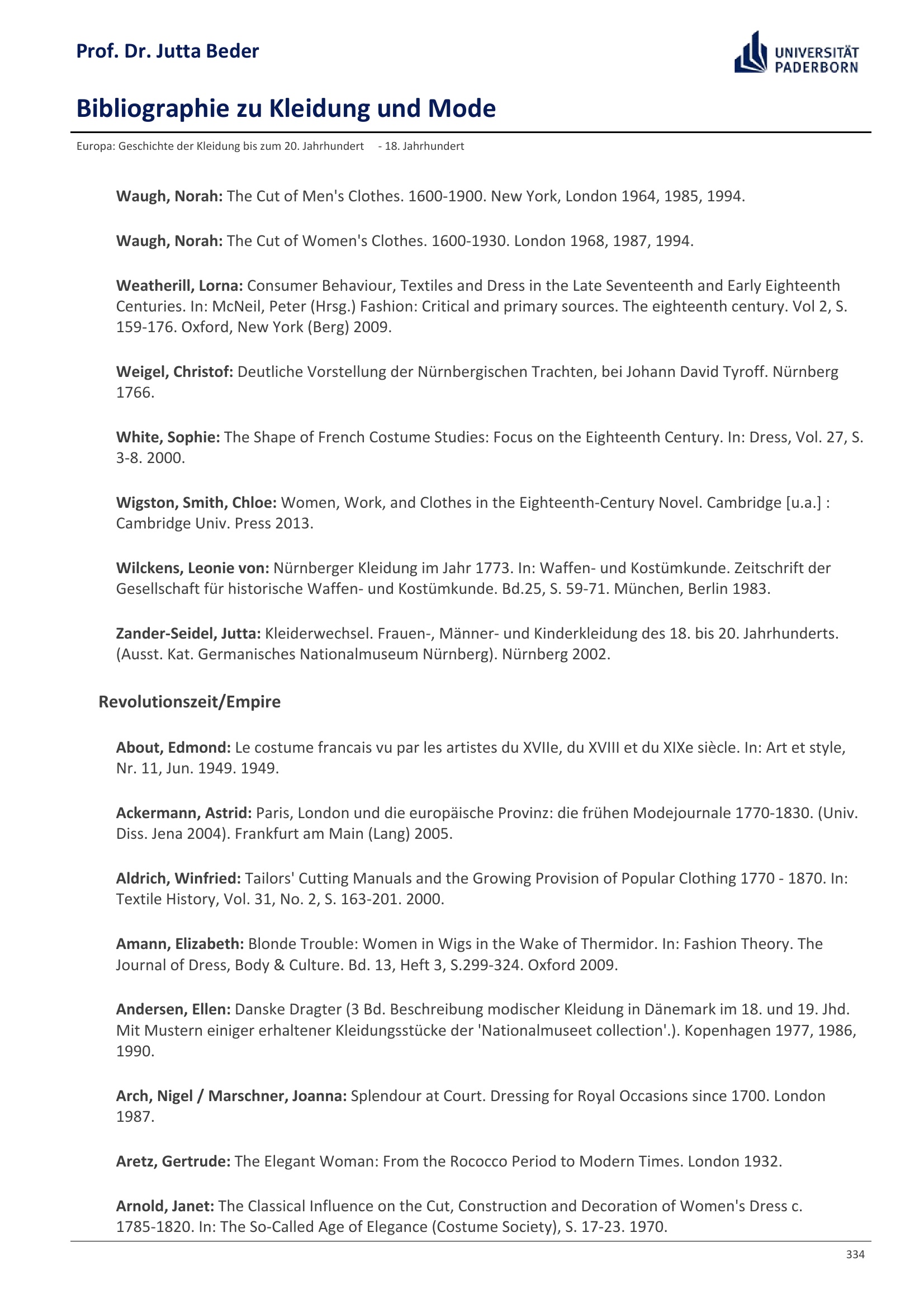 Bibliographie zu Kleidung und Mode / Prof. Dr. Jutta Beder