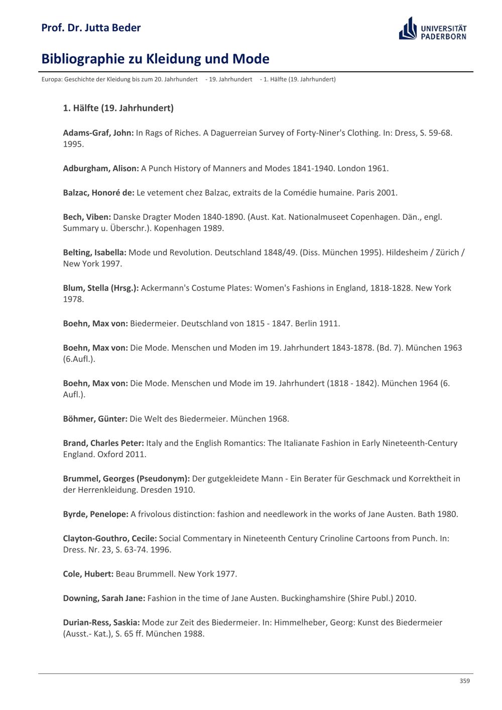 Bibliographie zu Kleidung und Mode / Prof. Dr. Jutta Beder