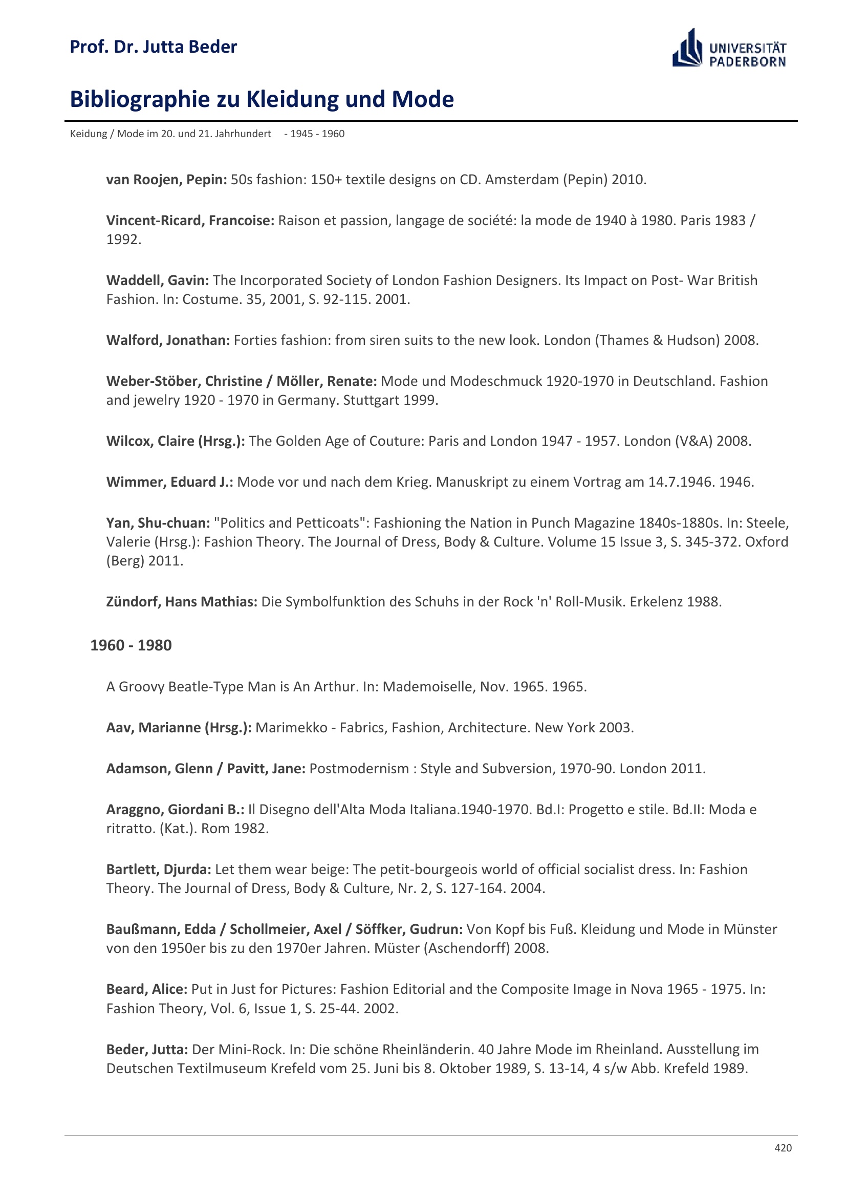 Bibliographie zu Kleidung und Mode / Prof. Dr. Jutta Beder