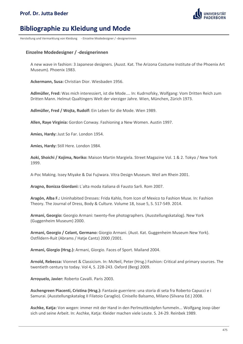 Bibliographie zu Kleidung und Mode / Prof. Dr. Jutta Beder