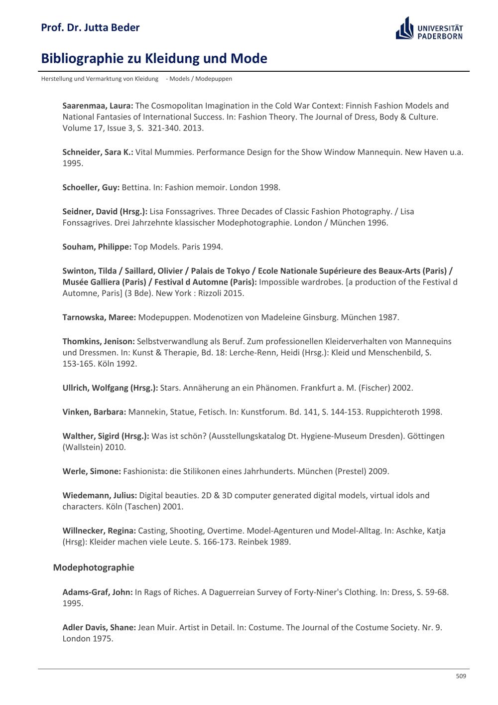 Bibliographie zu Kleidung und Mode / Prof. Dr. Jutta Beder