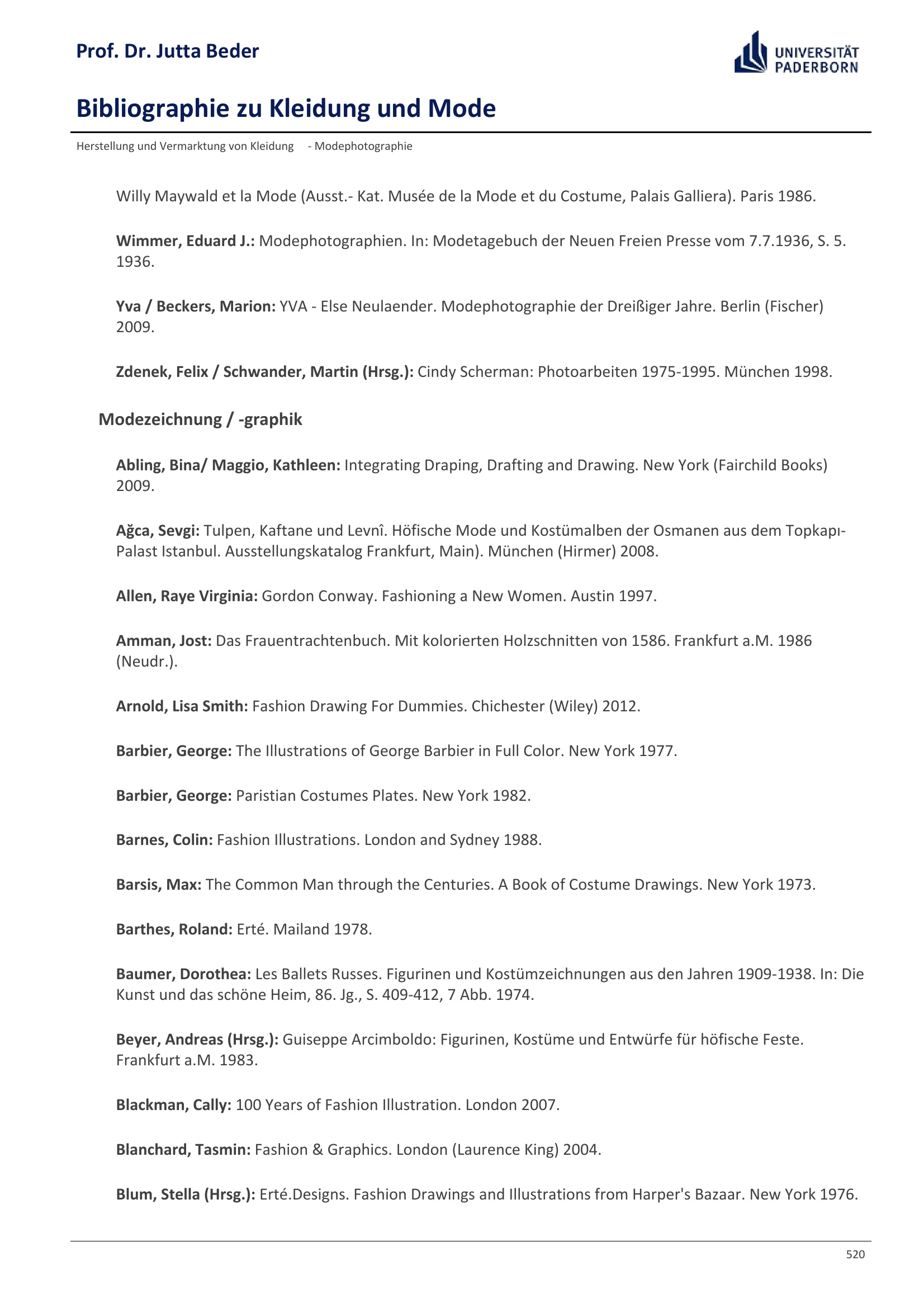 Bibliographie zu Kleidung und Mode / Prof. Dr. Jutta Beder