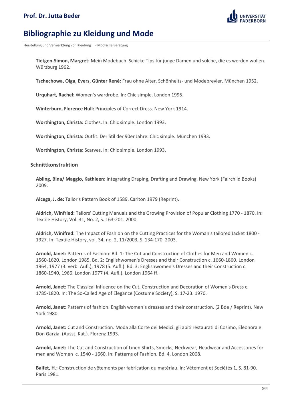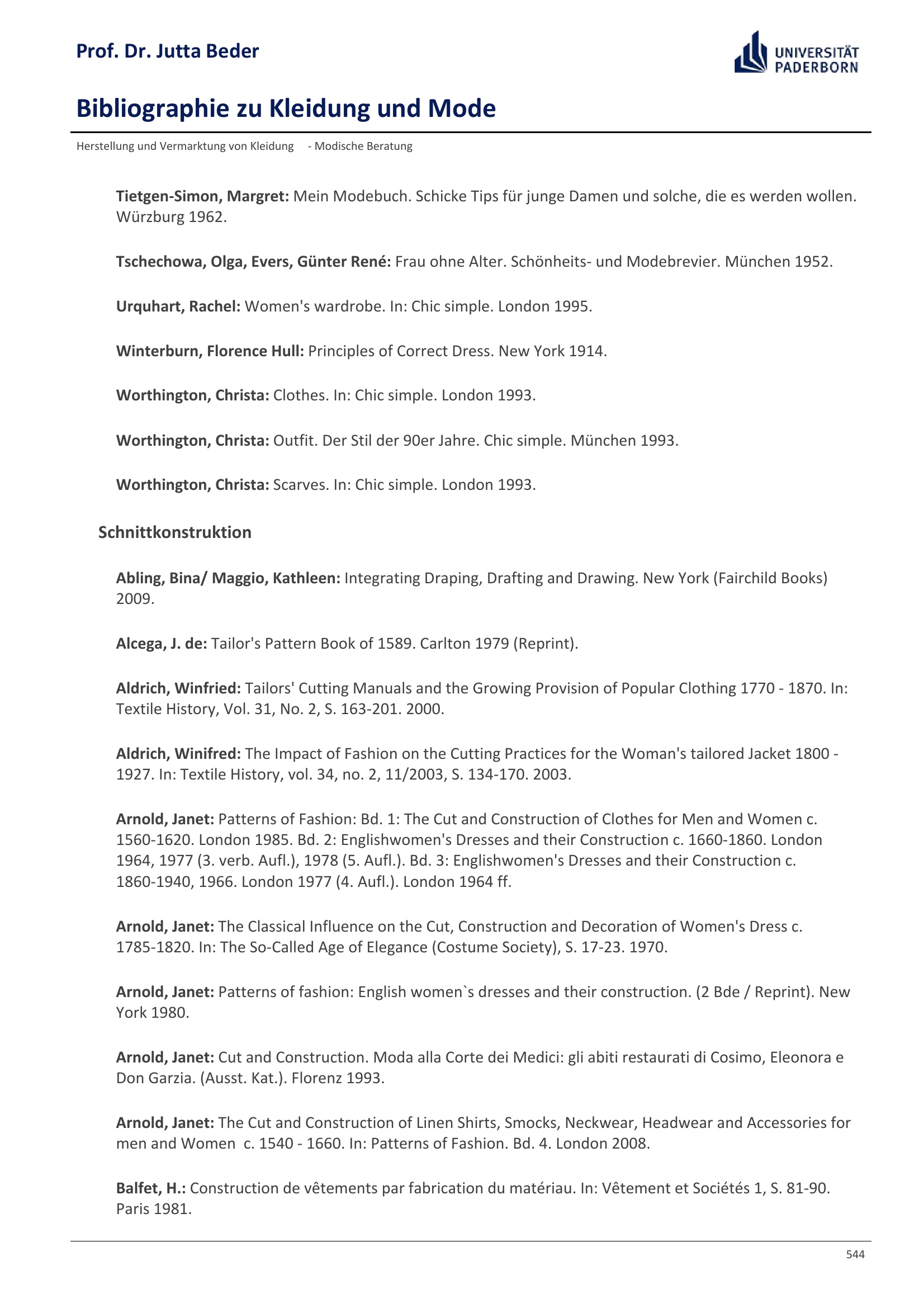 Bibliographie zu Kleidung und Mode / Prof. Dr. Jutta Beder
