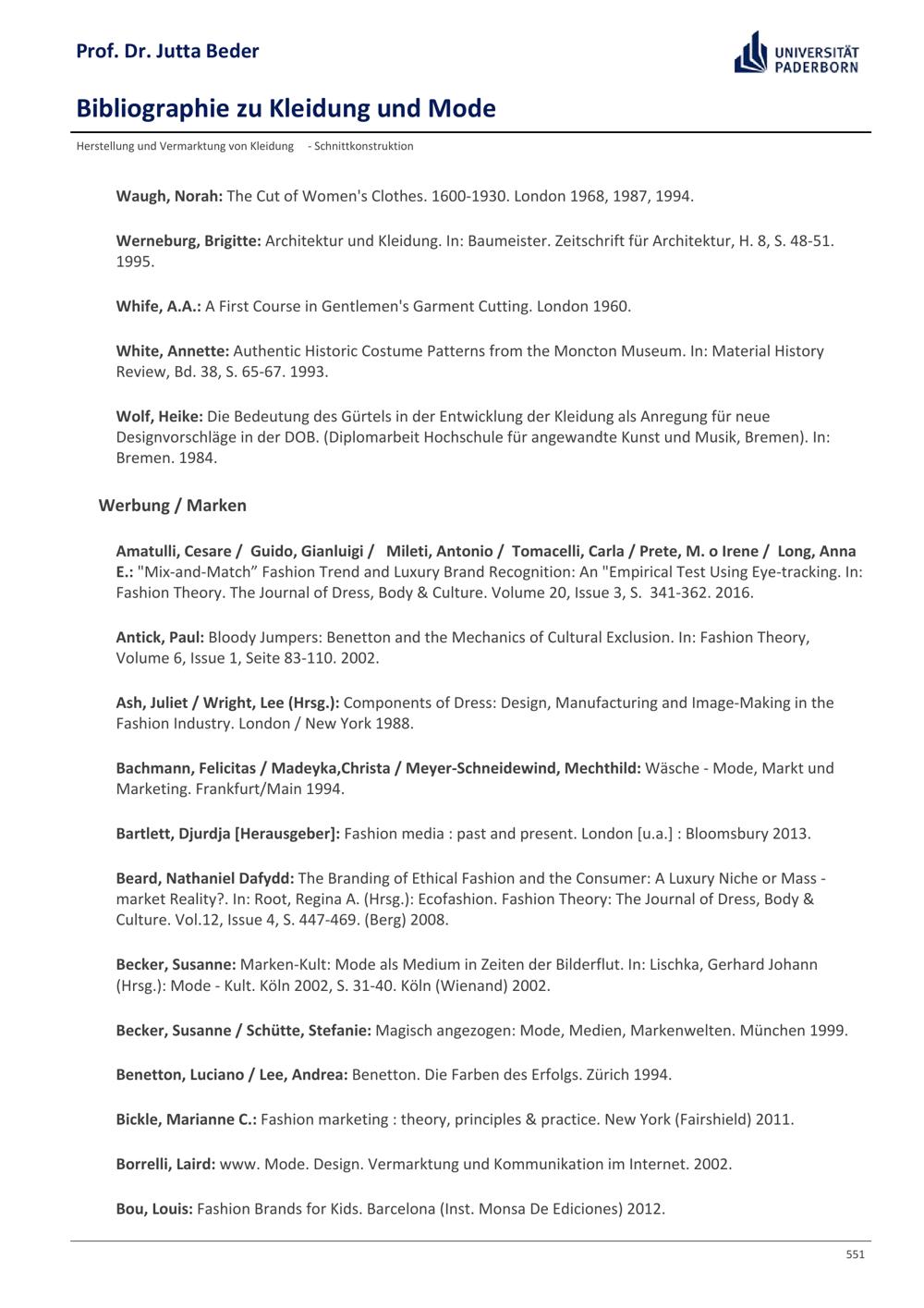 Bibliographie zu Kleidung und Mode / Prof. Dr. Jutta Beder
