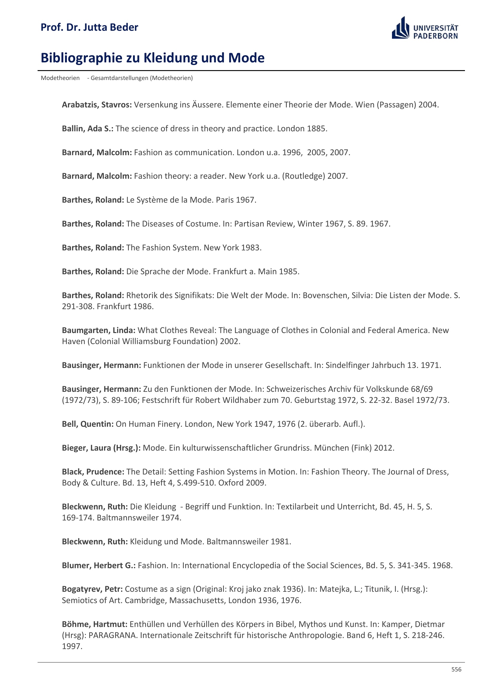 Bibliographie zu Kleidung und Mode / Prof. Dr. Jutta Beder