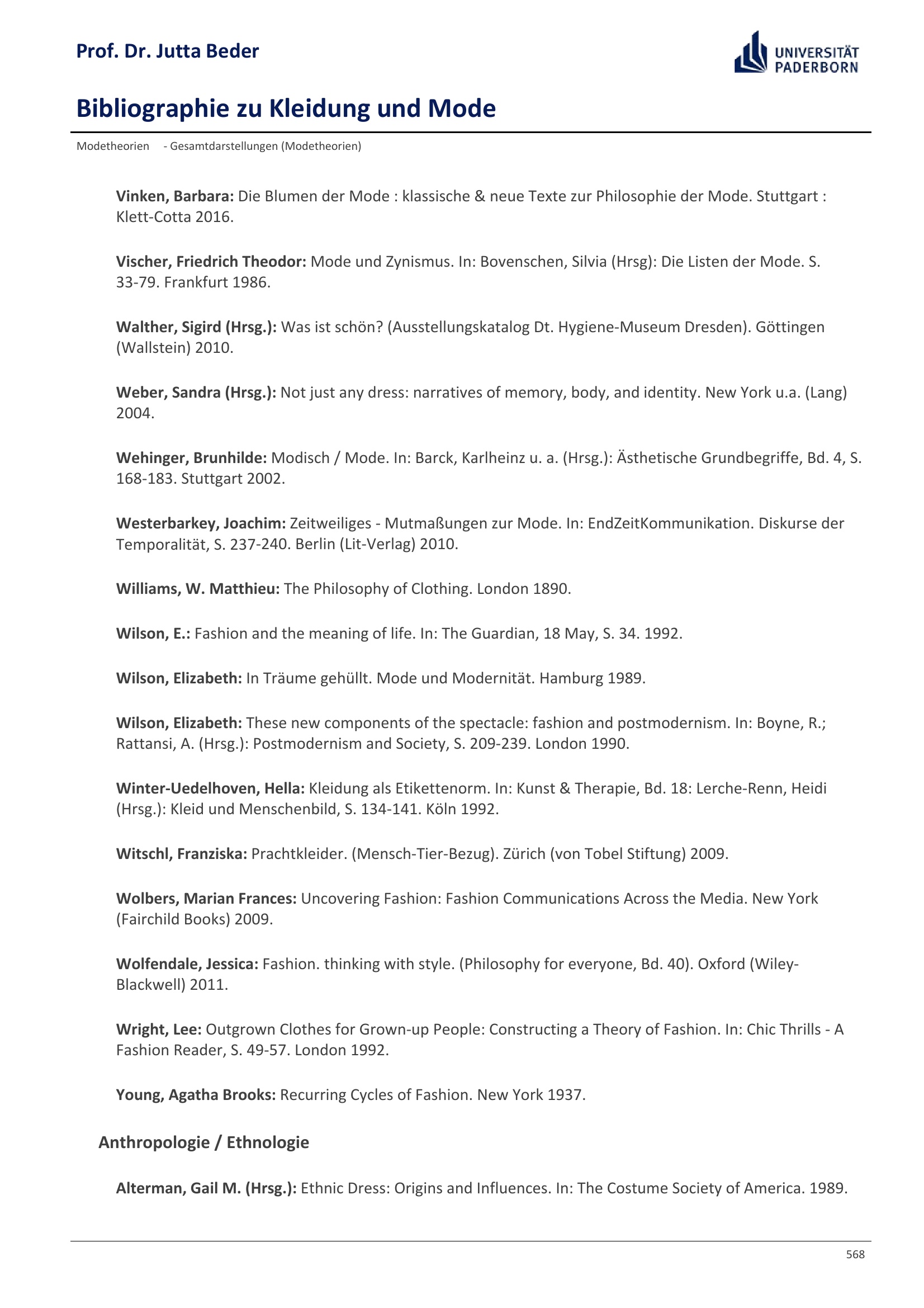 Bibliographie zu Kleidung und Mode / Prof. Dr. Jutta Beder