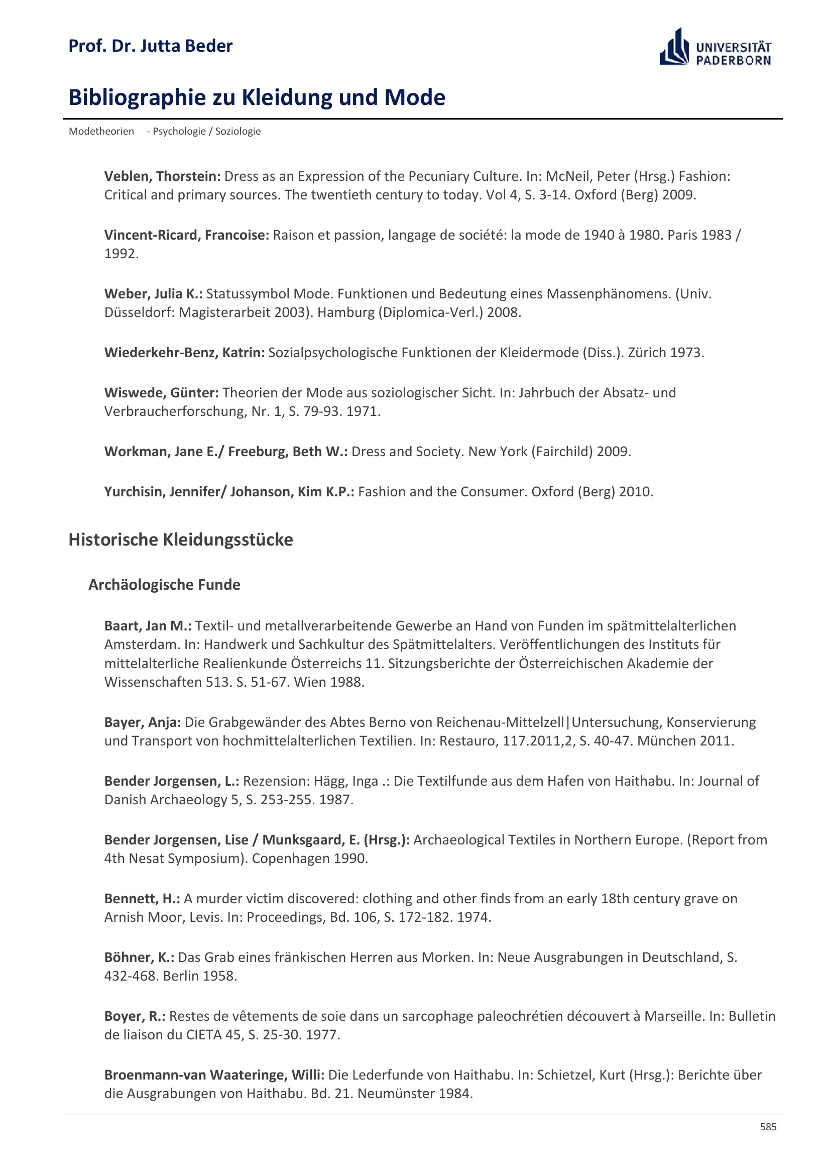 Bibliographie zu Kleidung und Mode / Prof. Dr. Jutta Beder
