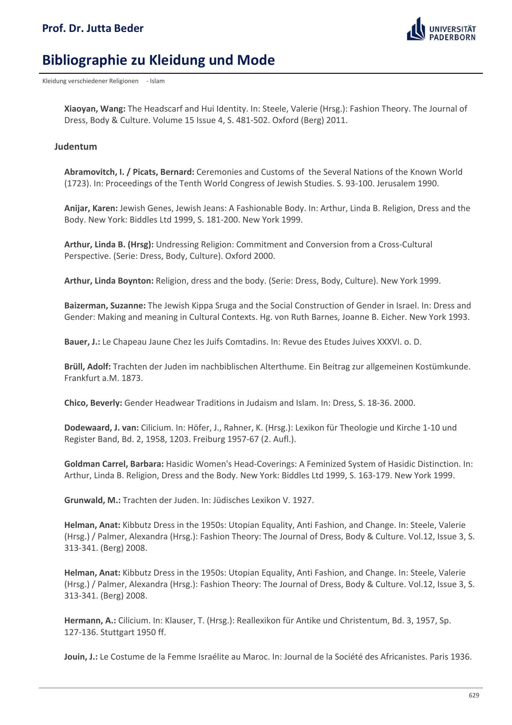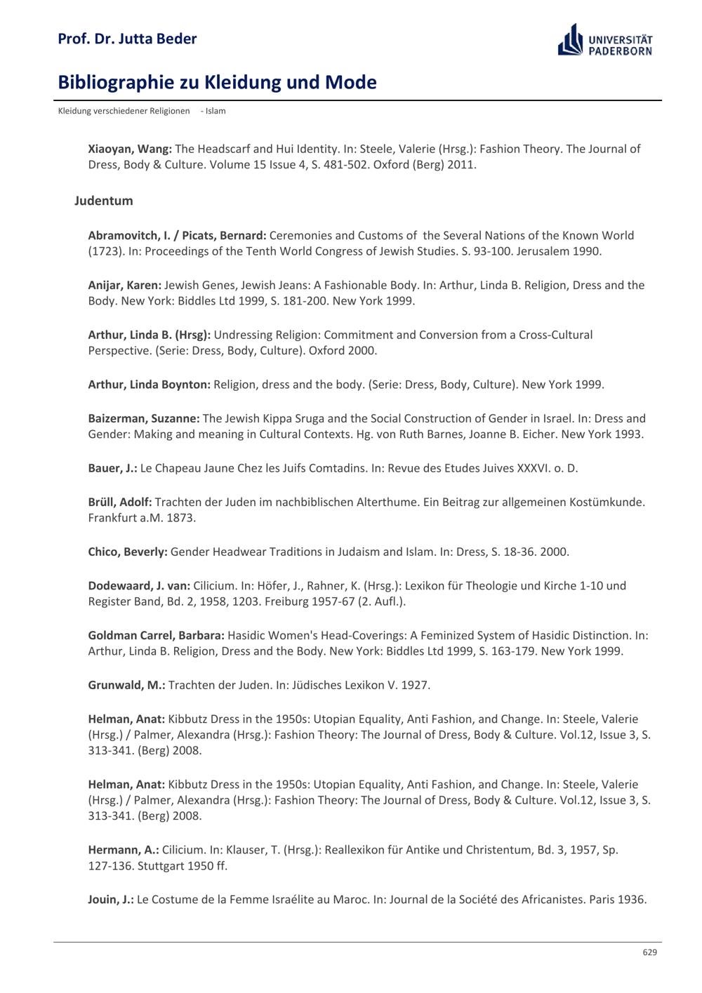 Bibliographie zu Kleidung und Mode / Prof. Dr. Jutta Beder