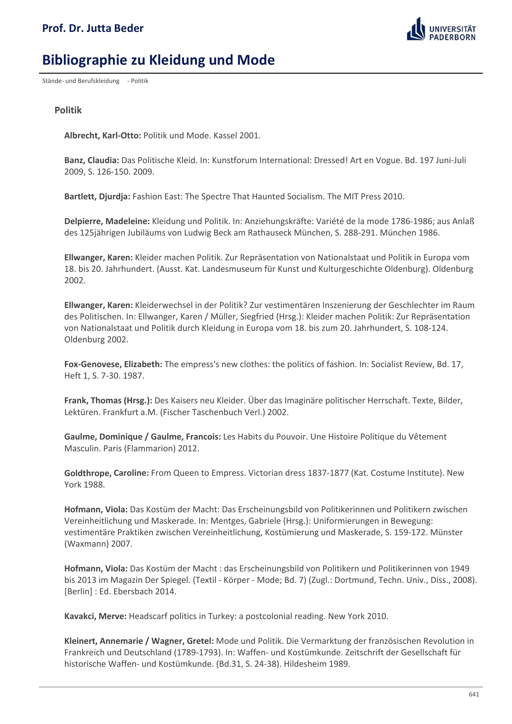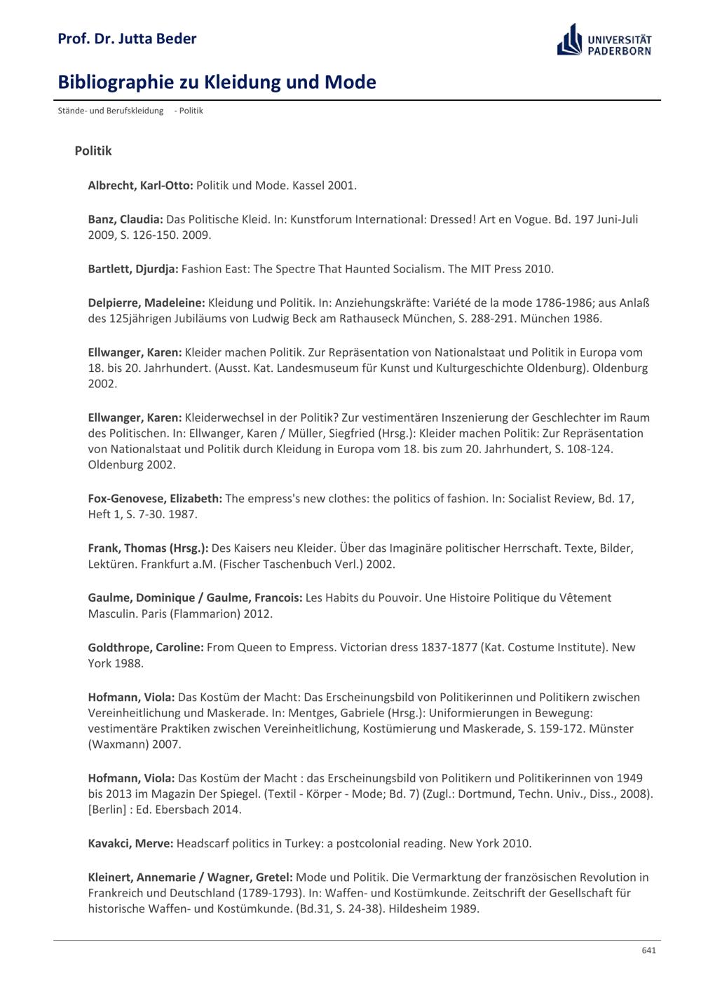 Bibliographie zu Kleidung und Mode / Prof. Dr. Jutta Beder