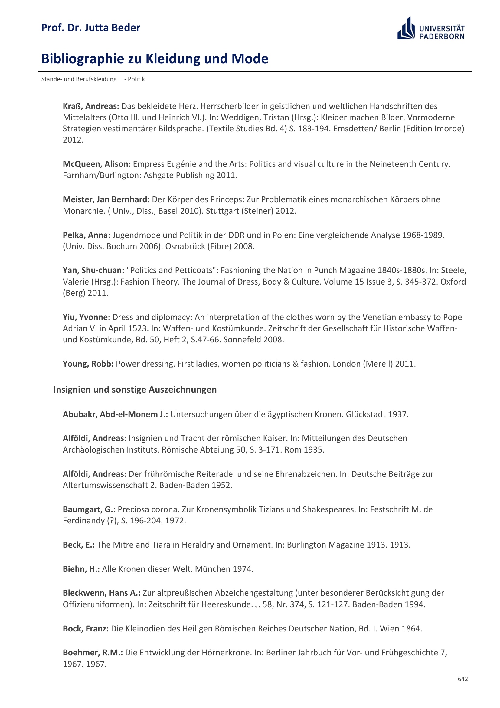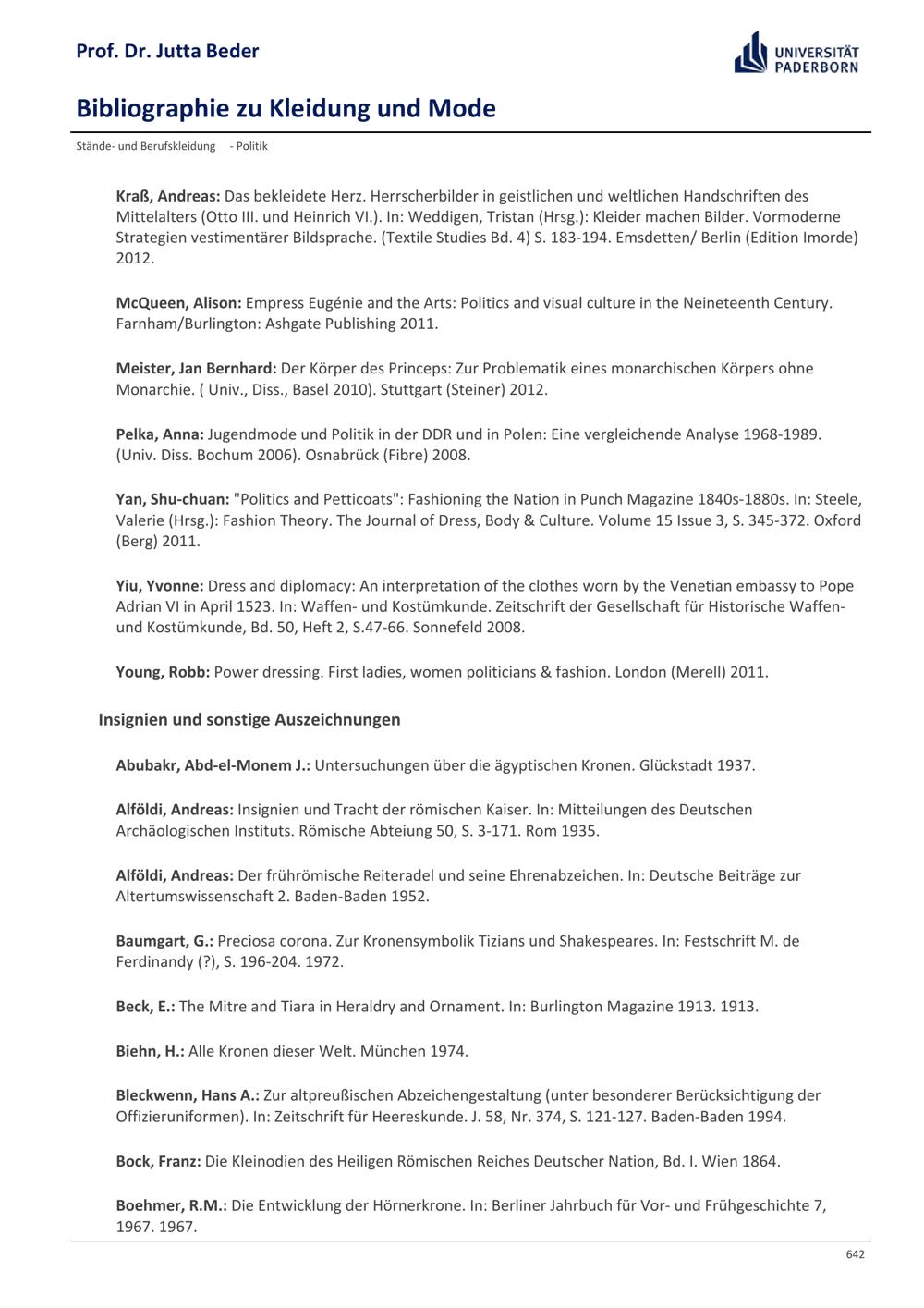 Bibliographie zu Kleidung und Mode / Prof. Dr. Jutta Beder