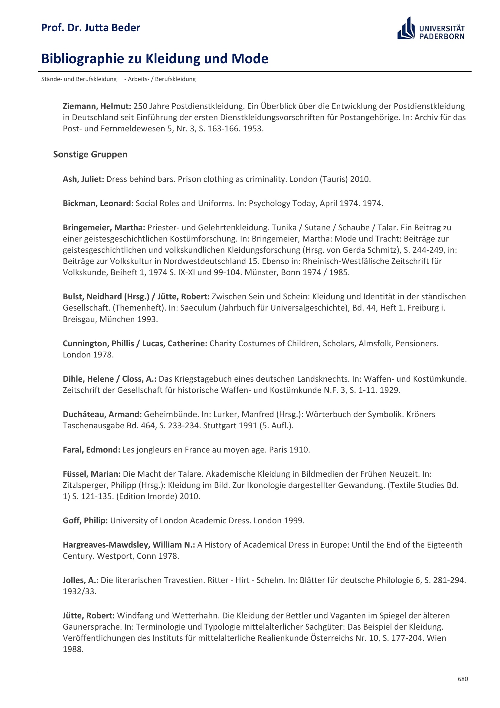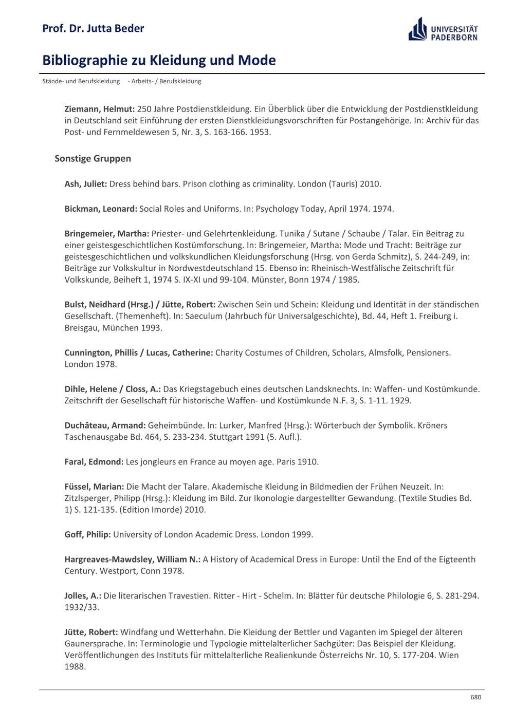 Bibliographie zu Kleidung und Mode / Prof. Dr. Jutta Beder