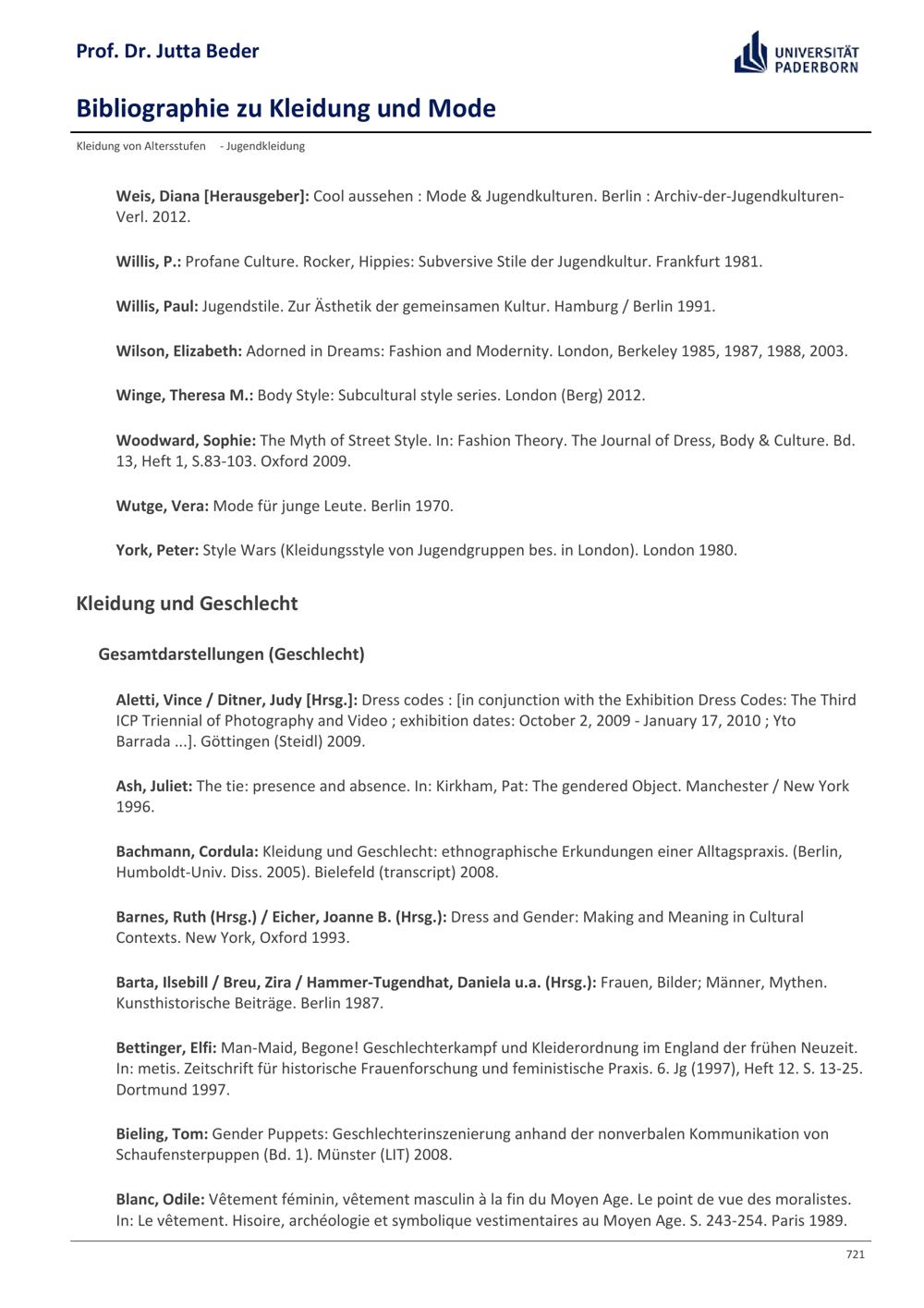 Bibliographie zu Kleidung und Mode / Prof. Dr. Jutta Beder