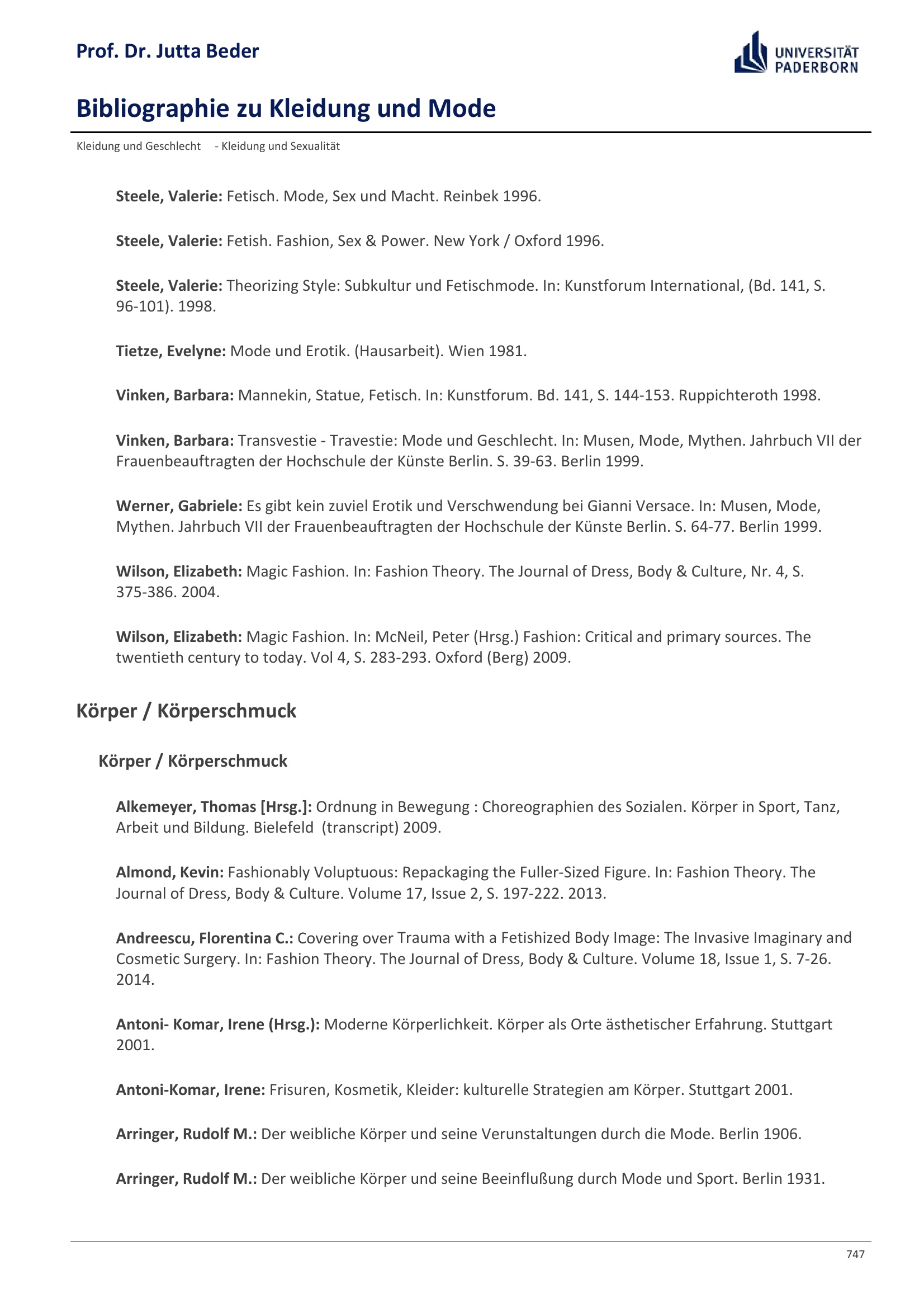 Bibliographie zu Kleidung und Mode / Prof. Dr. Jutta Beder