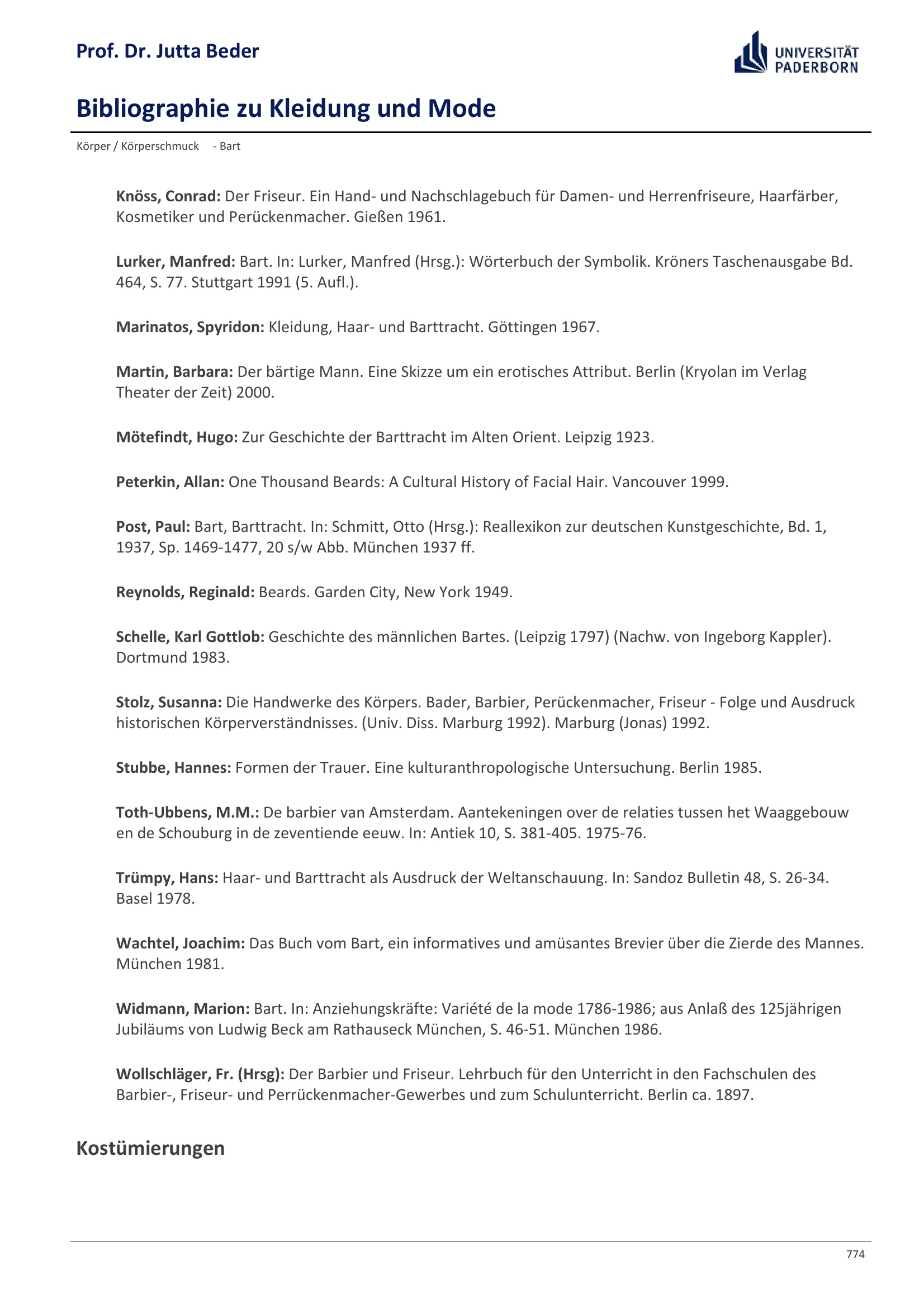 Bibliographie zu Kleidung und Mode / Prof. Dr. Jutta Beder