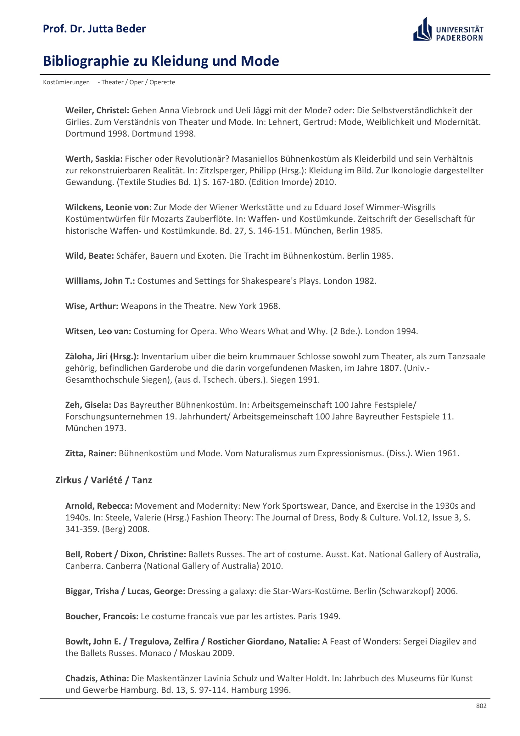 Bibliographie zu Kleidung und Mode / Prof. Dr. Jutta Beder