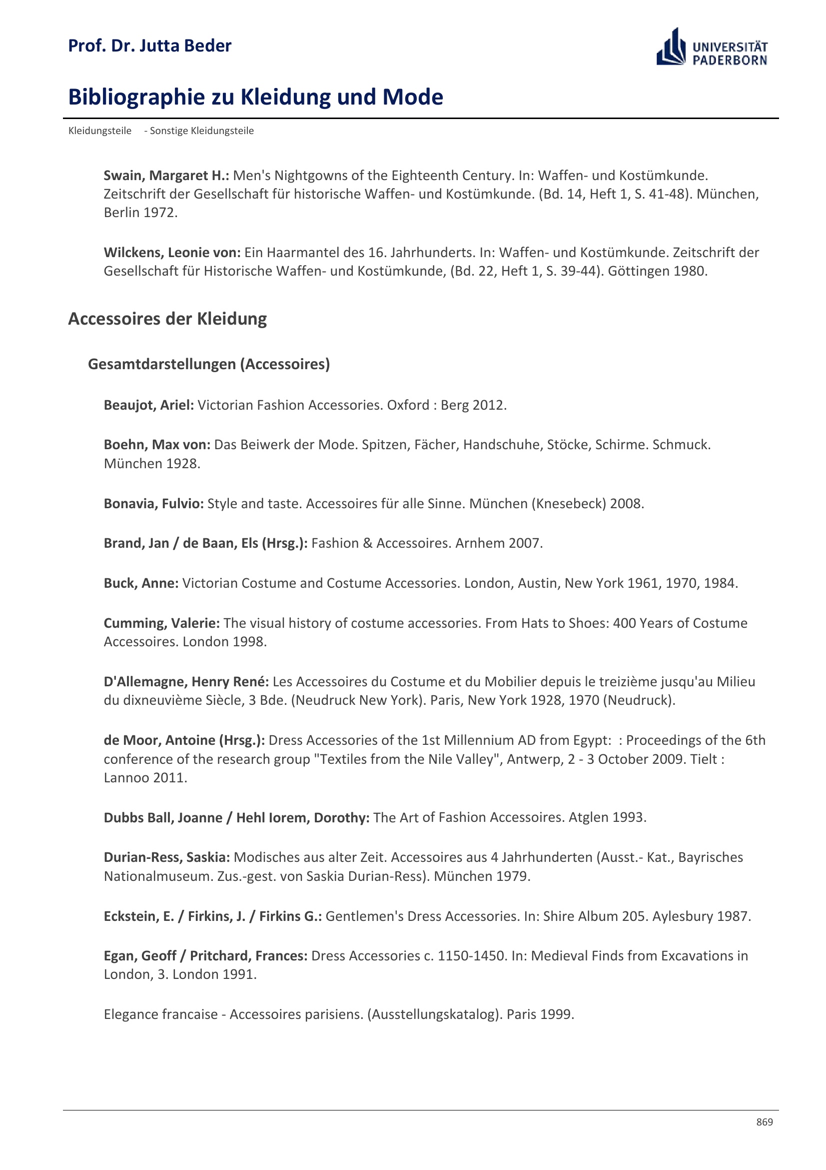 Bibliographie zu Kleidung und Mode / Prof. Dr. Jutta Beder