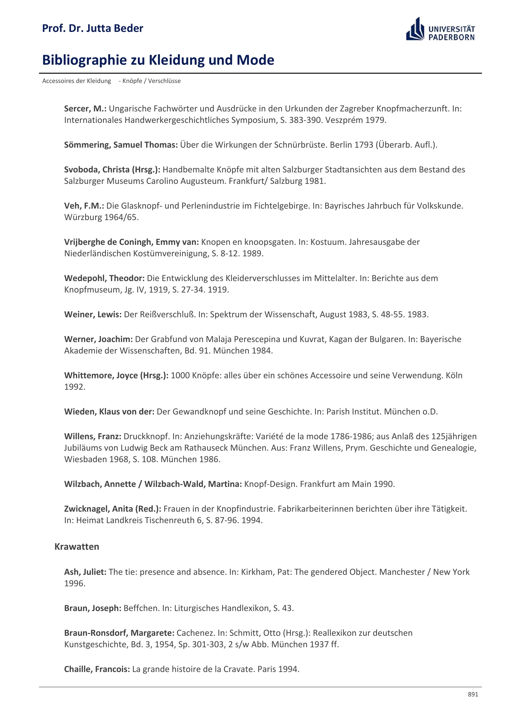 Bibliographie zu Kleidung und Mode / Prof. Dr. Jutta Beder
