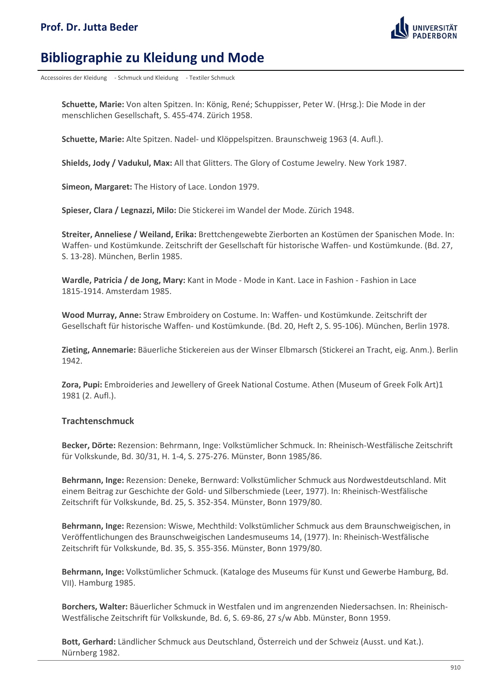 Bibliographie zu Kleidung und Mode / Prof. Dr. Jutta Beder